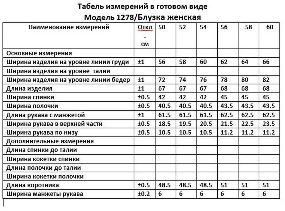 Таблица размеров