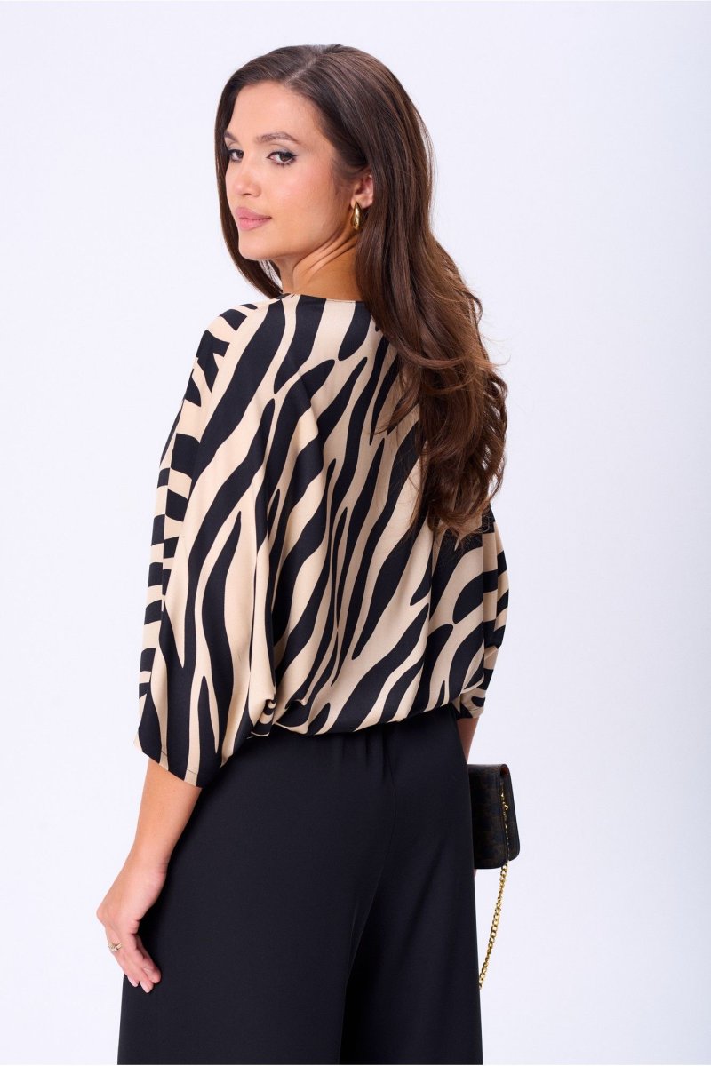 Элегантная блуза свободного силуэта от бренда «AXXA» со свободным спущенным плечом, и рукавом 3/4 типа «летучая мышь». Горловина округлой формы типа лодочка. Низ изделия обработан кулисой, что позволяет регулировать ширину блузы в области бедер. Выполнена из премиальной блузочной ткани с принтом. Эта блуза – находка как для вечерних образов, так и для повседневной жизни. Отлично сочетается с брюками, кюлотами и юбкой. Данная модель выгодно скрывает недостатки и подчеркивает достоинства, подойдет девушкам с любым типом фигуры. Идеальна для создания нарядных образов. Разнообразить образ также можно с помощью различных ярких аксессуаров.