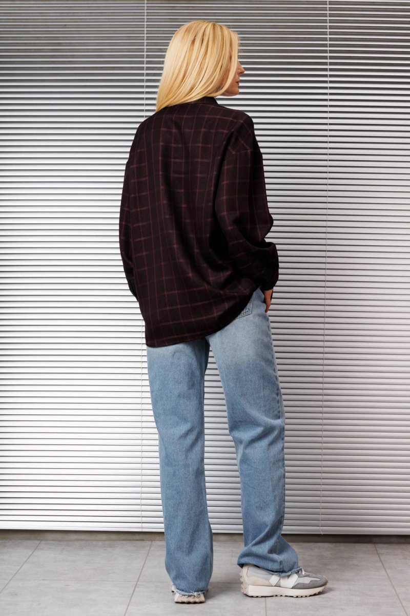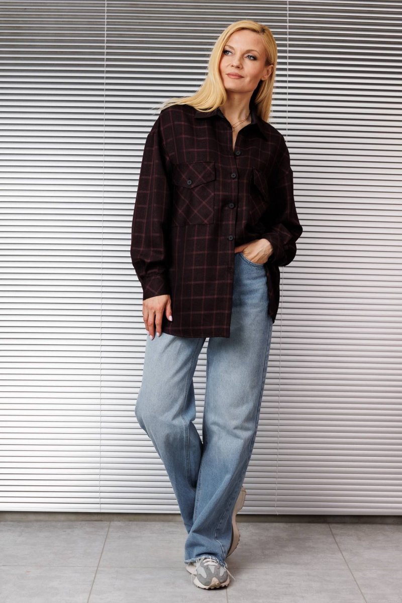 Блузка женская свободного покроя со спущенной и углублённой проймой и втачным рукавом с манжетой по низу рукава. По переду накладные карманы по линии груди, воротник рубашечный на стойке, застёжка спереди на петли и пуговицы.Низ изделия фигурный.