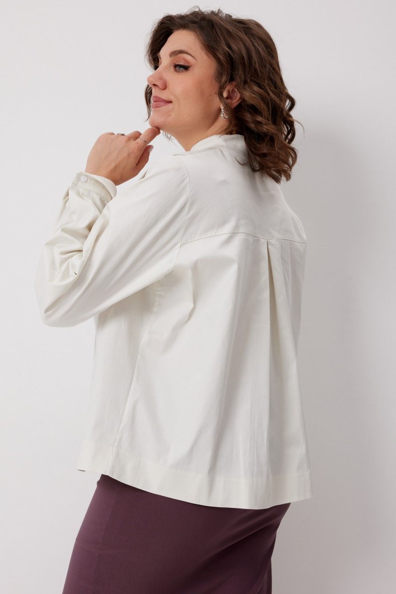 Блуза прямого кроя с воротником стойкой и декоративным деталями в виде отложного воротника , на планке с застёжкой на петли- пуговицы, с нагрудными вытачками. Рукав втачной на манжете. Край манжета и планки имеет фигурную форму. Спинка на кокетке со встречной складкой.
