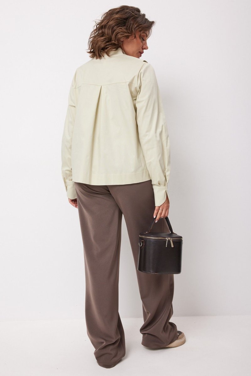 Блуза прямого кроя с воротником стойкой и декоративным деталями в виде отложного воротника , на планке с застёжкой на петли- пуговицы, с нагрудными вытачками. Рукав втачной на манжете. Край манжета и планки имеет фигурную форму. Спинка на кокетке со встречной складкой.