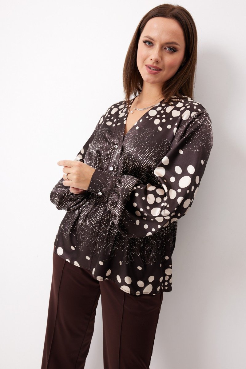 Блуза свободного кроя. Передняя часть на притачной планке, имеющей застёжку на петли-пуговицы. V-образный вырез формирует красивое декольте.