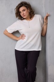 Блуза полуприлегающего кроя с горловиной полукруглой формы, обработанной обтачкой с открытым срезом. Линия плеча слегка спущена. Рукав короткий, втачной, на манжете из основного материала. Низ изделия обработан декоративной плоскошовной строчкой.