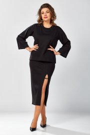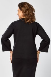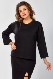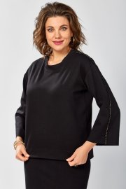 Модель с округлым вырезом, обработанным обтачкой из основной ткани, пройма слегка спущена. Рукав ¾ расширяется к низу, вдоль рукава настрочена декоративная тесьма контрастного цвета с вплетением люрекса золотистого цвета. Низ рукава и низ изделия обработаны подгибкой.