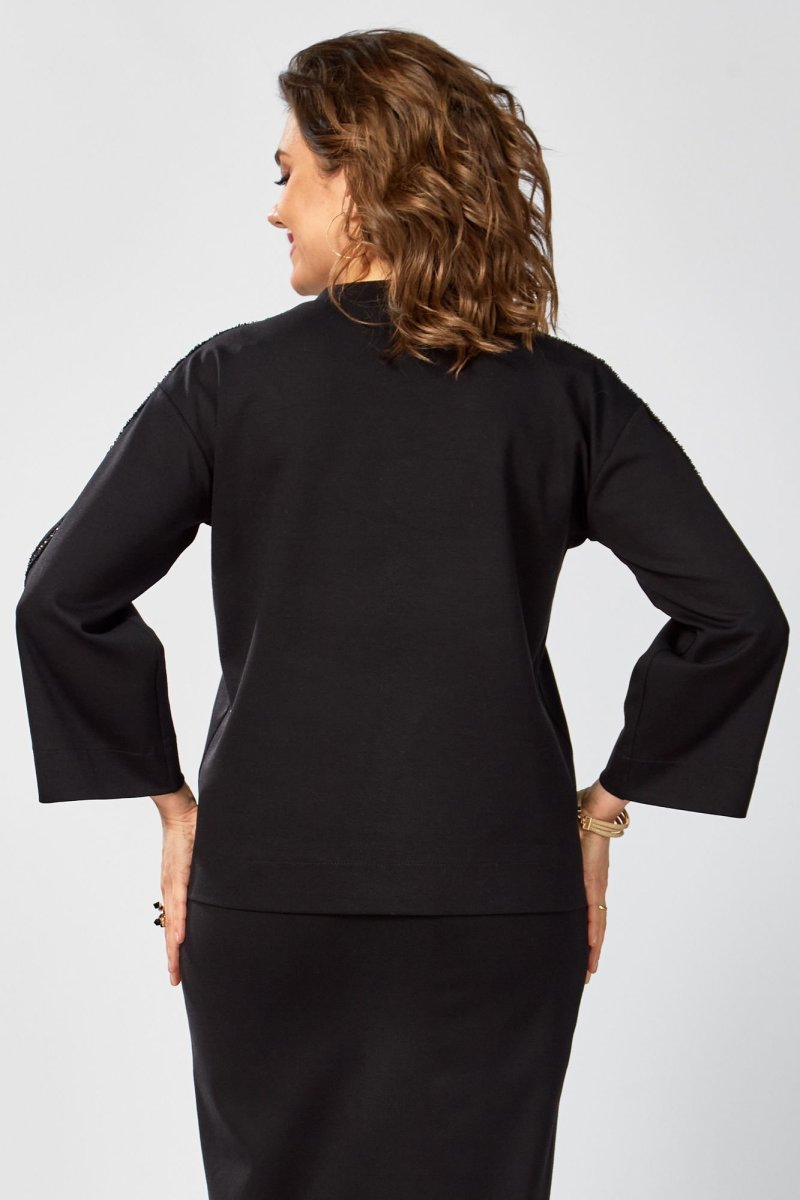 Представляем вам стильный черный свитшот свободного кроя, который станет незаменимой вещью в вашем гардеробе. Изготовленный из высококачественной ткани с приятным содержанием вискозы, он гарантирует исключительный комфорт и мягкость при носке. Элегантная пришивная тесьма с золотистым люрексом, расположенная по всей длине рукава, придает этой модели утонченный блеск и делает ее по-настоящему особенной. Этот свитшот прекрасно подойдет как для повседневных выходов, так и для создания более нарядных образов.