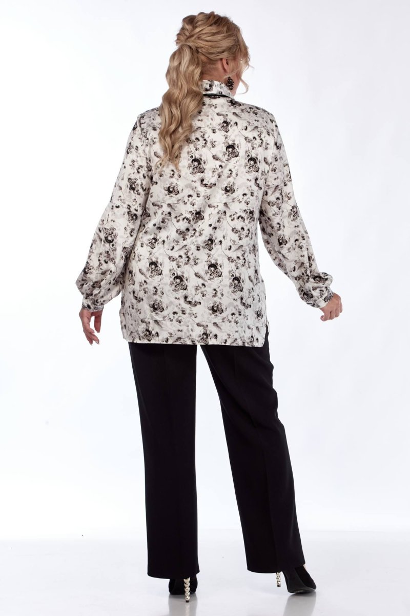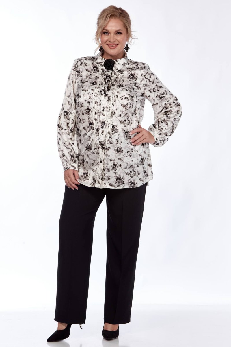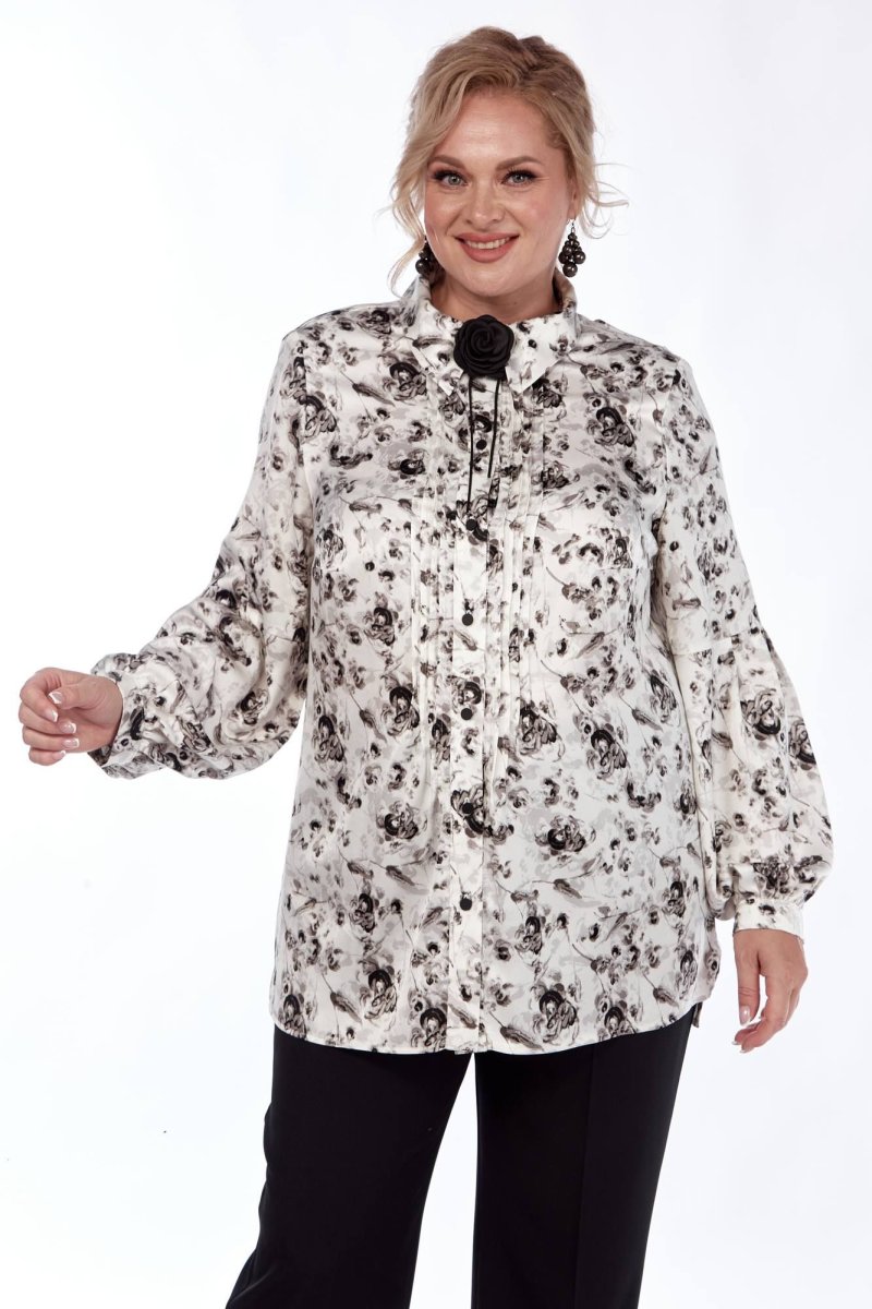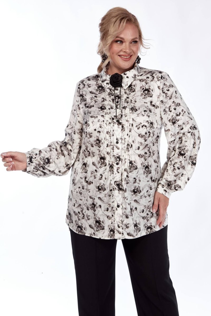 Блуза прямого силуэта из нежной, принтованной ткани. Украшают детали изделия декоративные застроченные складки , подчеркивая романтичный стиль. Полочка с нагрудными вытачками, по центру полочки застежка в виде планки на 7 петель, 7 пуговиц. Воротник стояче-отложной, рукав-баллон втачной, внизу обработан притачной манжетой. В боковых швах не большие разрезы. Украшение данной блузы является брошь, которая входит в комплект.