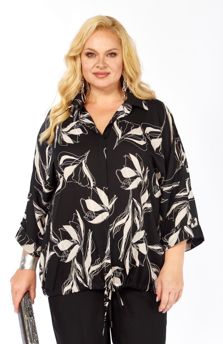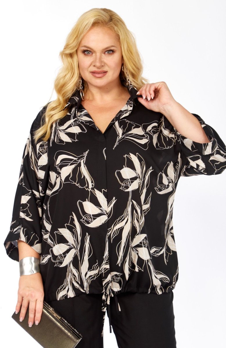 Блузка прямого силуэта из принтованной ткани с красивым цветовым акцентом. Вырез горловины V-образной формы, воротник классический рубашечный на отложной стойке. По центру полочки выполнена планка. Модель с цельнокроеным рукавом, низ оформлен с застежкой на пату, образ выглядит стильно. Низ блузы на кулиске, используется для равномерной сборки изделия.