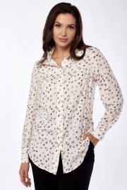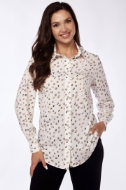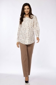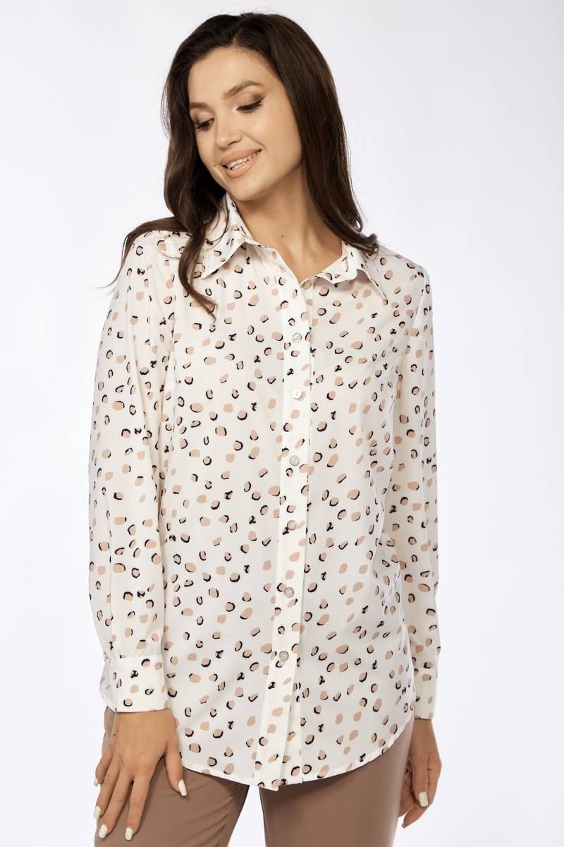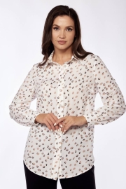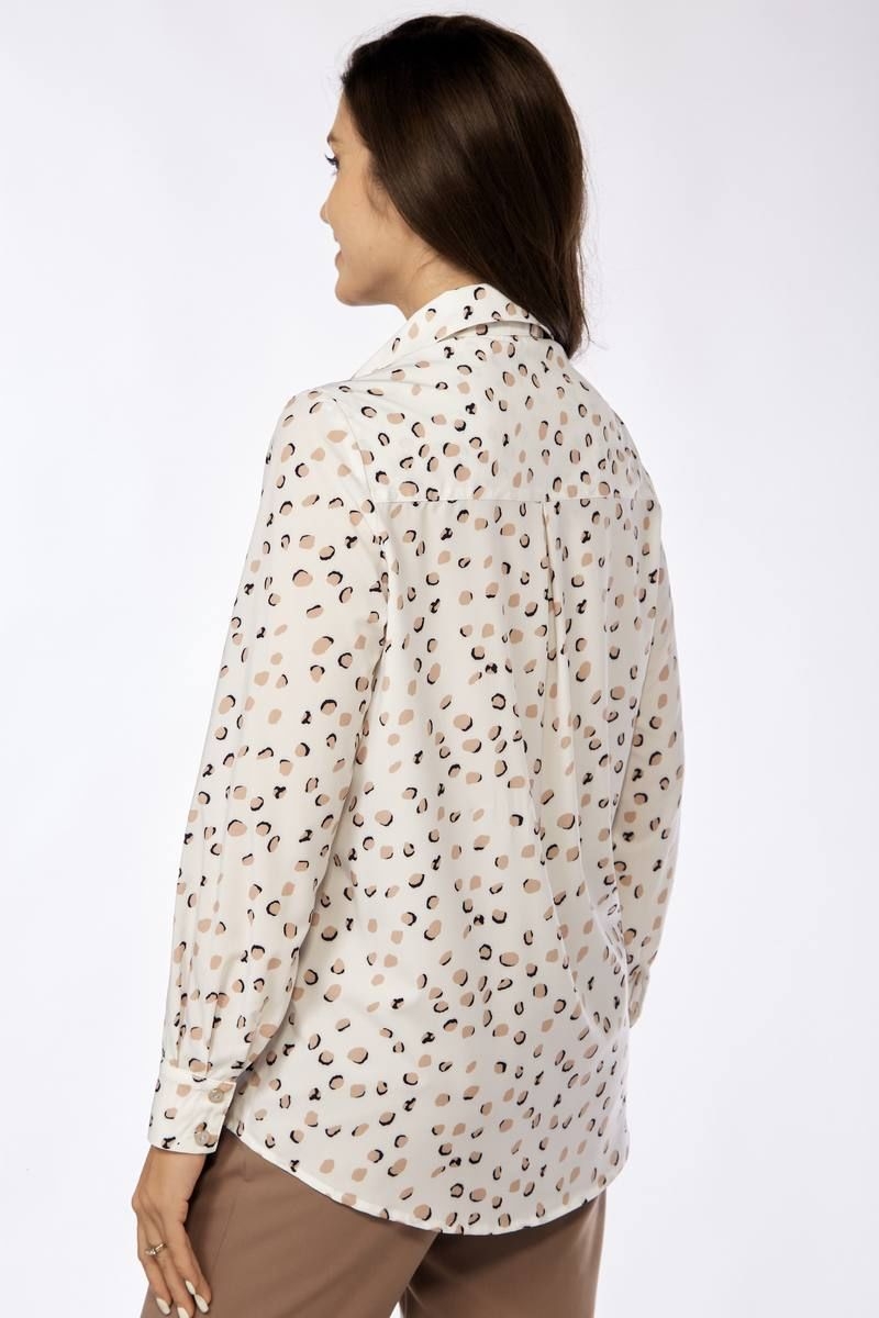 Блузка женская, прямого силуэта. Мультидизайн. Горловина круглая с отложным воротником на стойке. Застежка сквозная на петли и пуговицы. Рукав втачной, длинный с манжетом на застежку. Низ рукава оформлен манжетой на петли и пуговицы. Низ изделия фигурный.