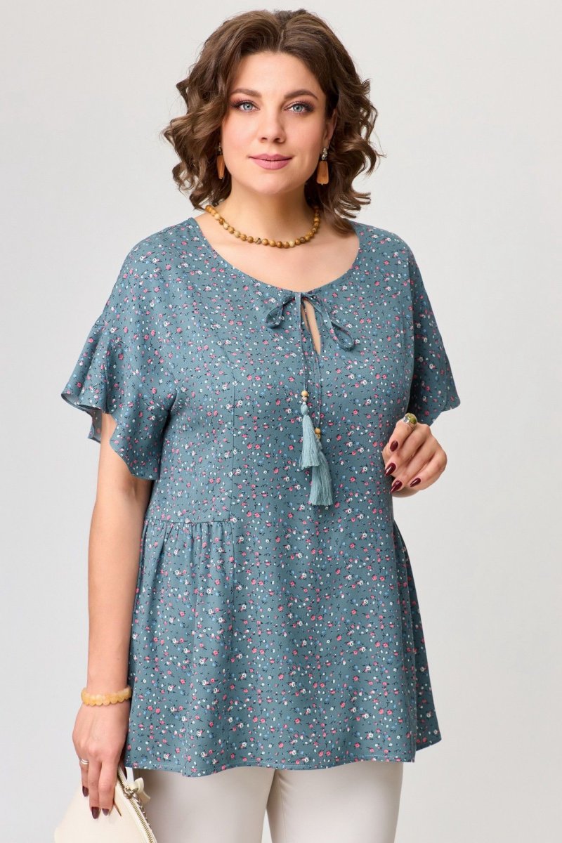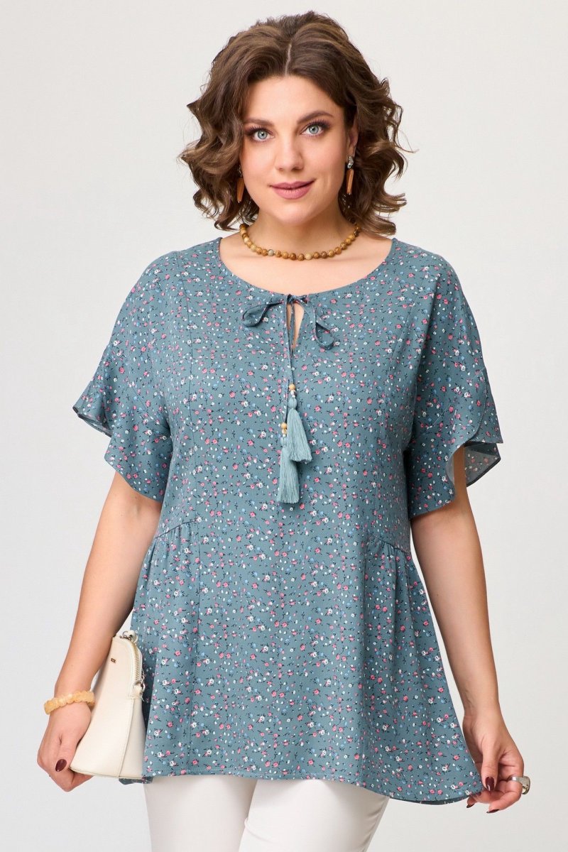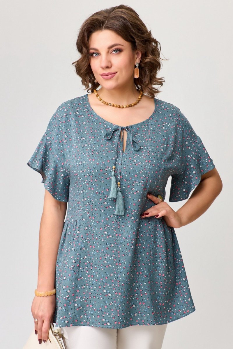 Блузка женская МОРЕНА изготовлена из ткани: штапель-твил в мелкий рубчик с цветным принтом. Блузка полуприлегающего силуэта со спущенным рукавом, по полочке и спинке рельефы, по талии подрезы со сборкой. Горловина блузки обработана обтачкой и застежка на завязки-кисточки. Низ изделия обработан швом в подгибку с закрытым срезом. По низу рукава пришит волан, низ волана обработан швом в подгибку с закрытым срезом.