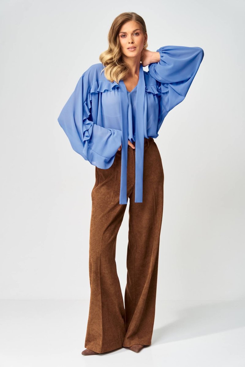 Блузка свободного силуэта из струящейся шифоновой ткани. Перед и спинка с кокеткой и сборкой. Рукав спущенный свободный с резинкой понизу. Вдоль линии кокетки и рукава вставлена рюша. Горловина V-образной формы с воротником стойкой переходящей в бант. Длина блузки - 67 см, длина рукава - 60 см. Обратите внимание! Данная модель прекрасно сочетается с другими моделями из нашей коллекции 35204 и 15377 в коричневом цвете. Создайте гармоничный образ, комбинируя эти изделия!