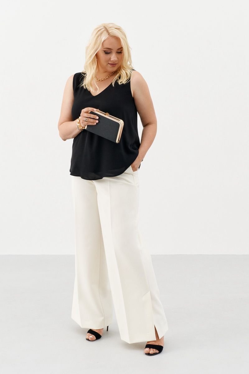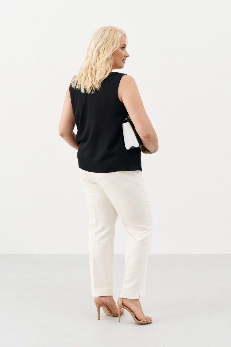 Блузка свободного силуэта из однотонной ткани без рукава на вискозной подкладке. Красивая легкая блузка, слегка расширенная к низу. Стильная вещь, которая отлично сочетается с жакетами, пиджаками и кардиганами. Однотонная блузка станет основой вашего гардероба и разнообразит комплекты повседневной одежды, а также может стать частью вечернего образа.
