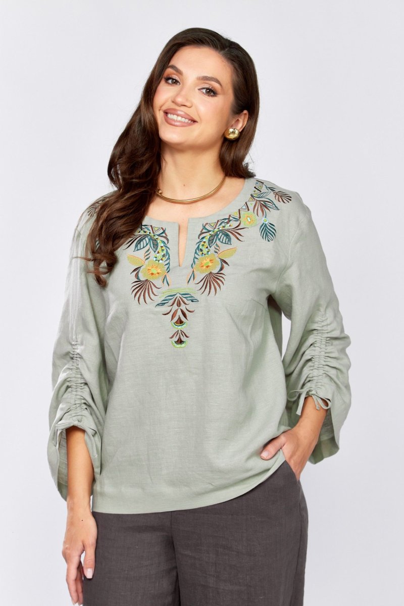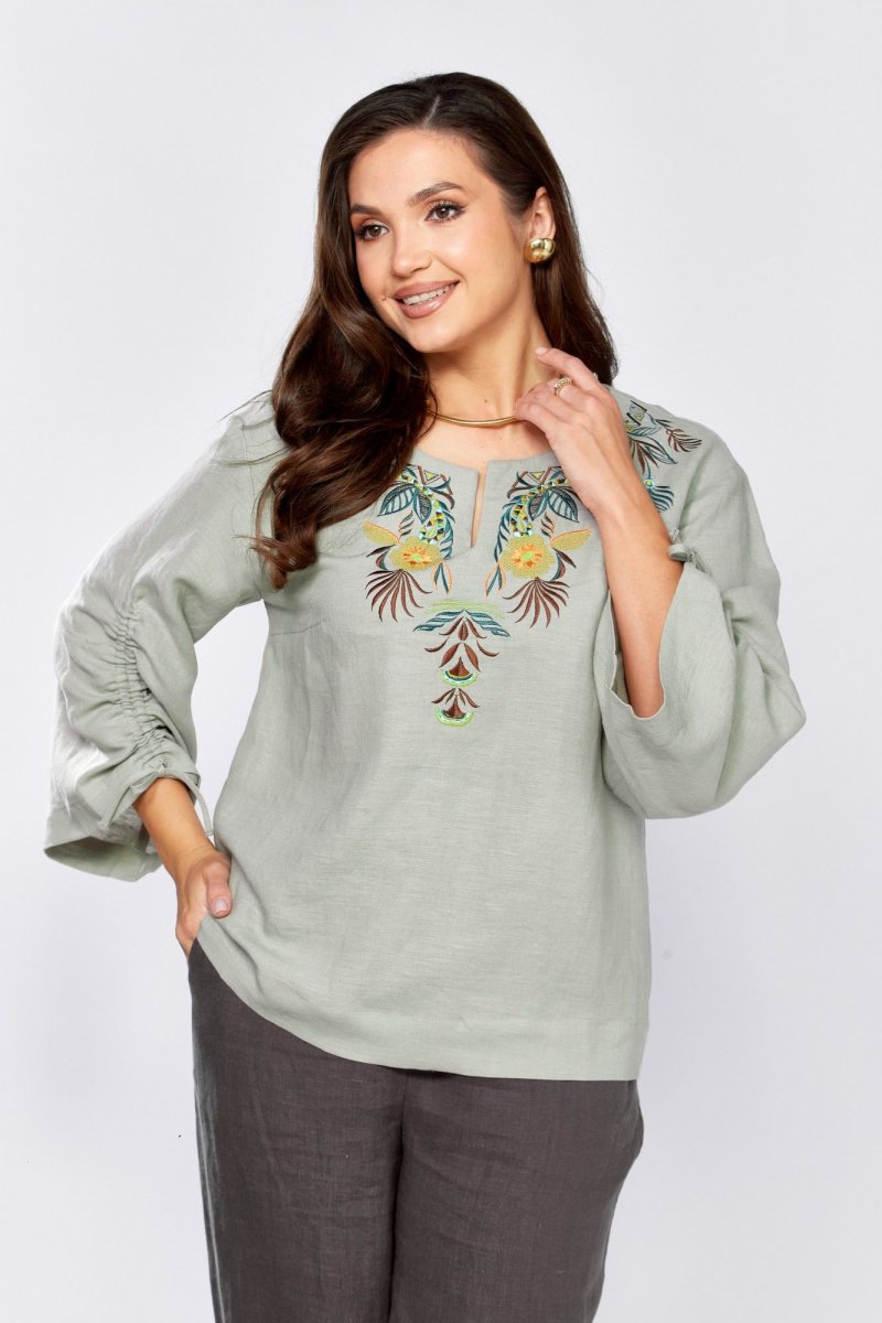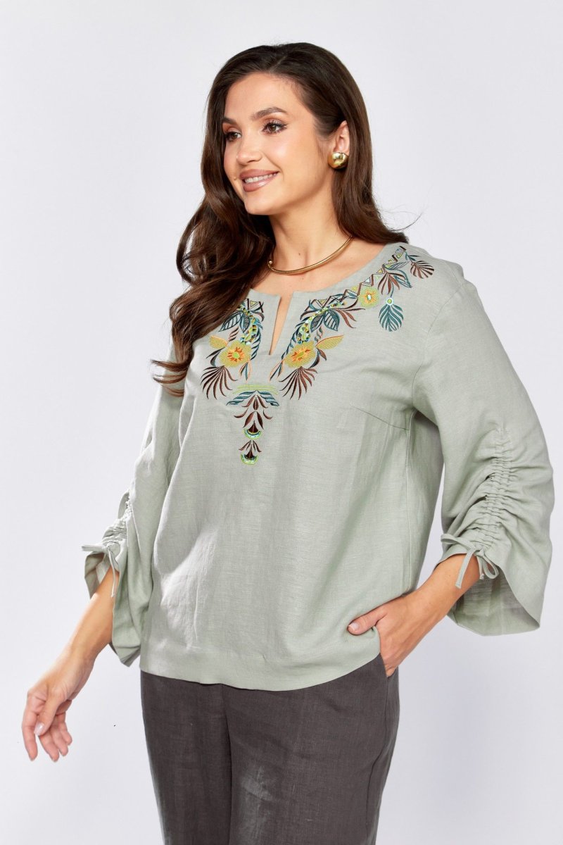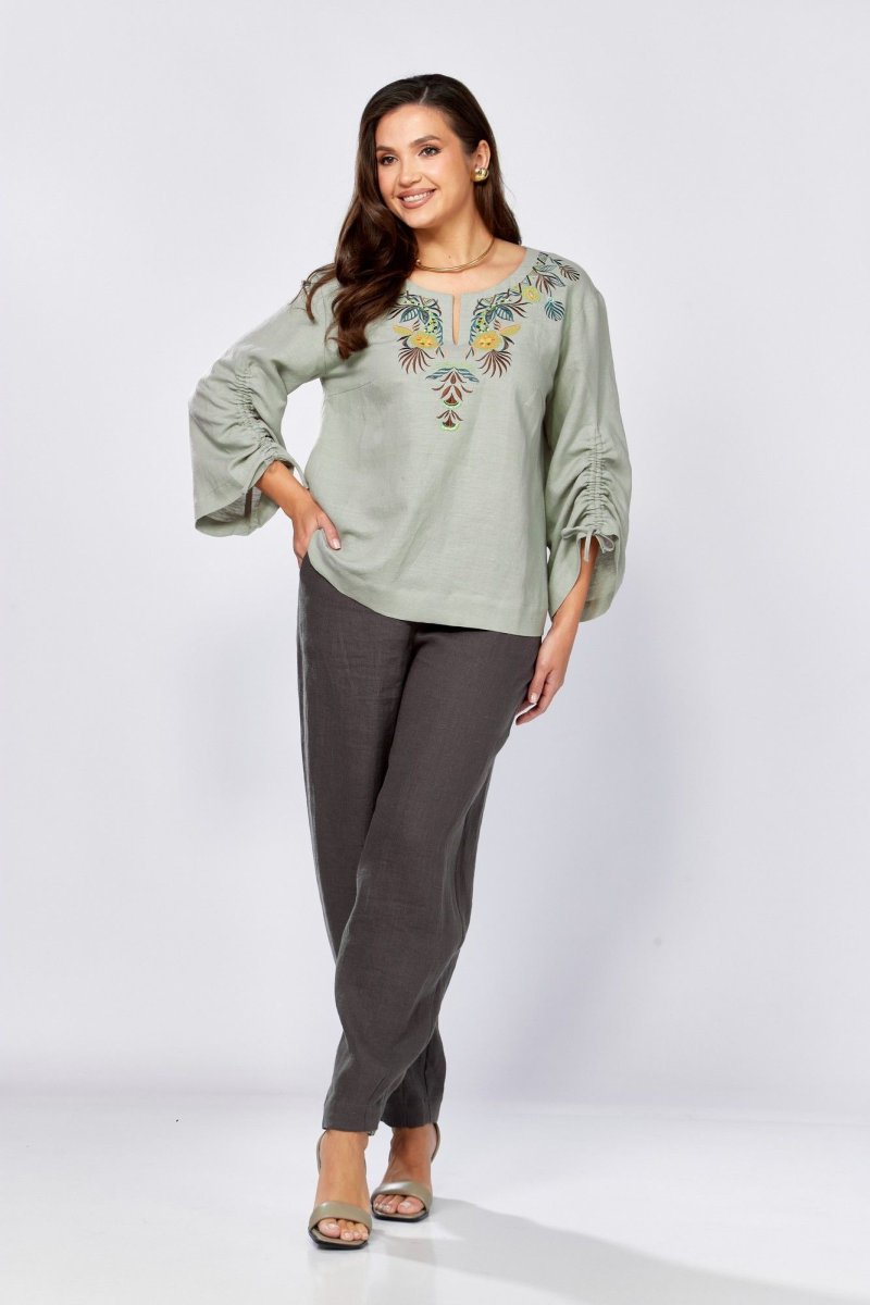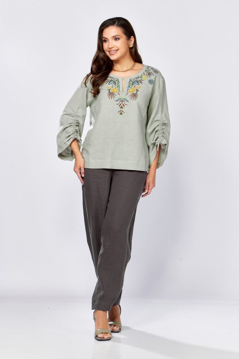 Блуза прямого силуэта.По переду нагрудные вытачки и декоративная вышивка .Плечо немного спущено. Рукав 3/4, расширен к низу , обработан кулиской. Горловина округлой формы с вырезом .