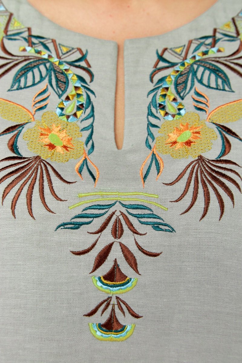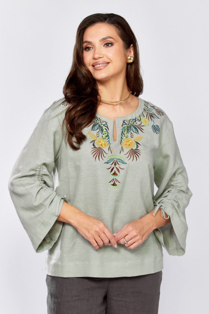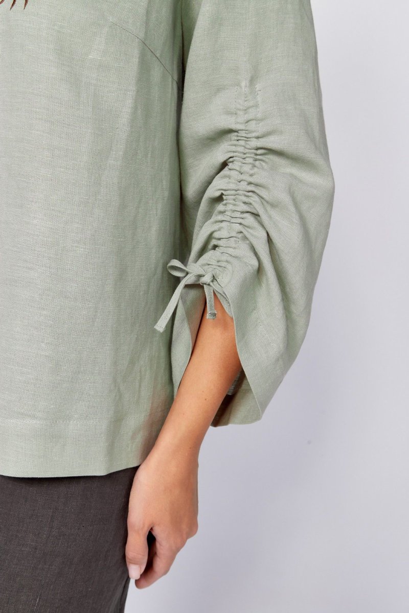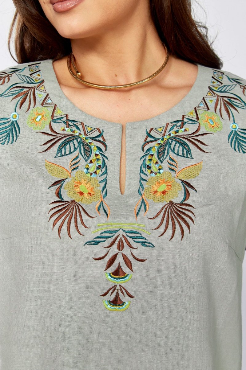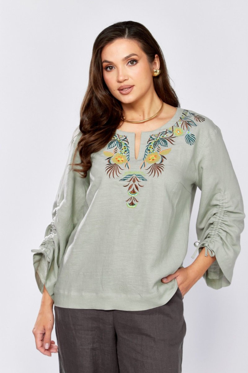 Блуза прямого силуэта.По переду нагрудные вытачки и декоративная вышивка .Плечо немного спущено. Рукав 3/4, расширен к низу , обработан кулиской. Горловина округлой формы с вырезом .