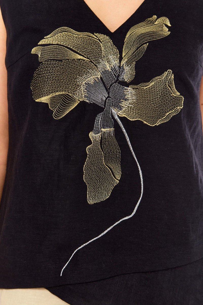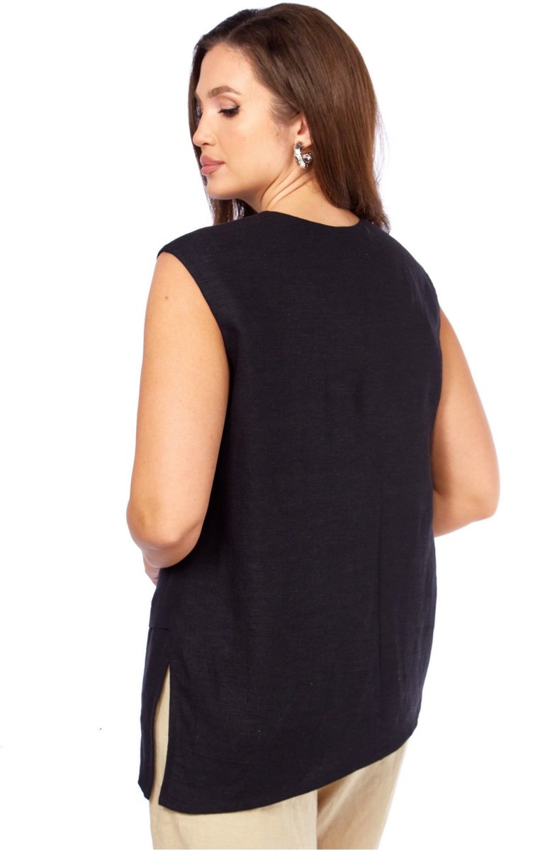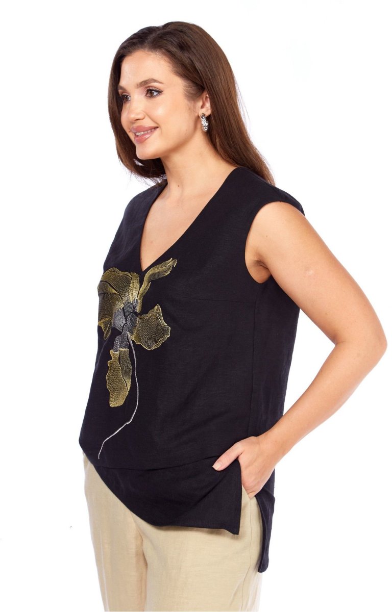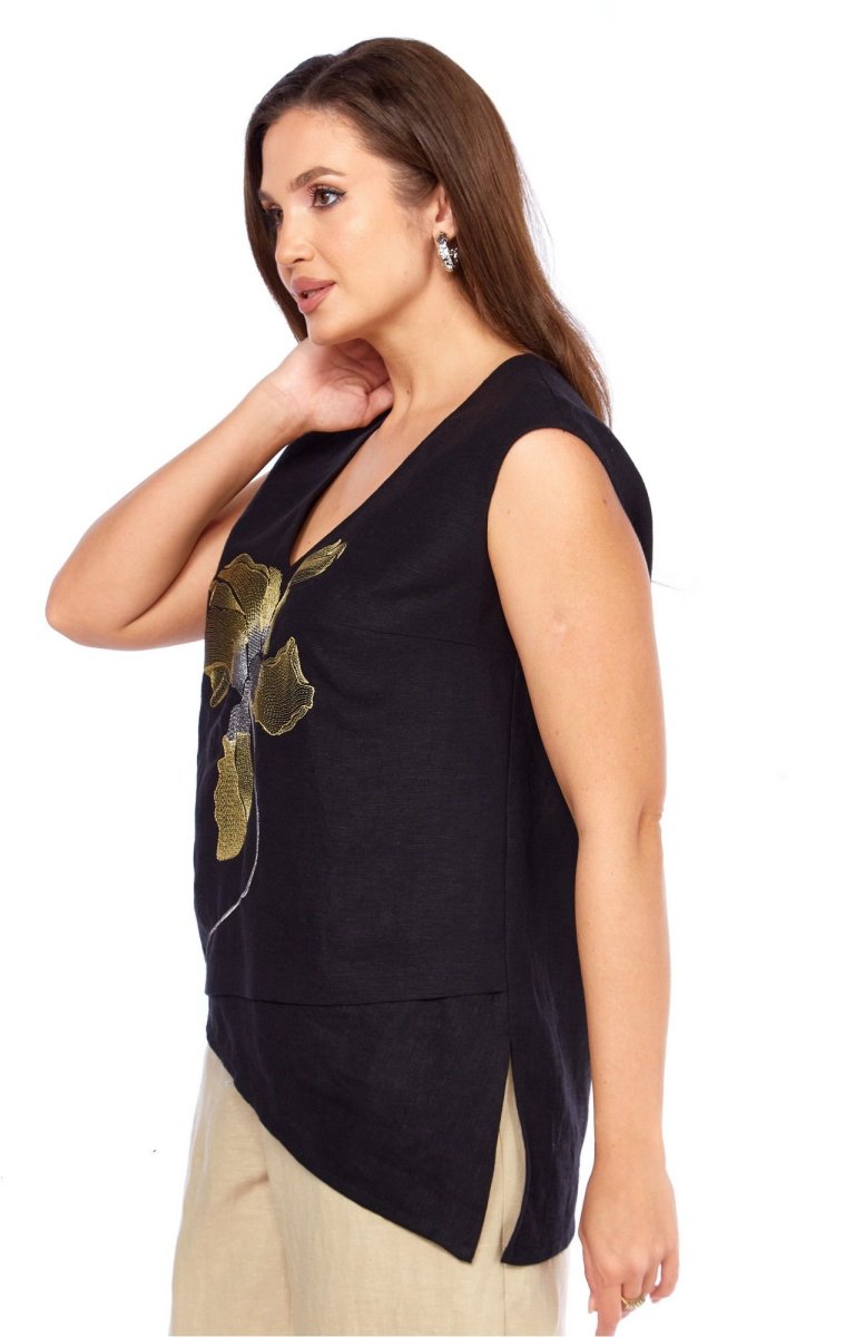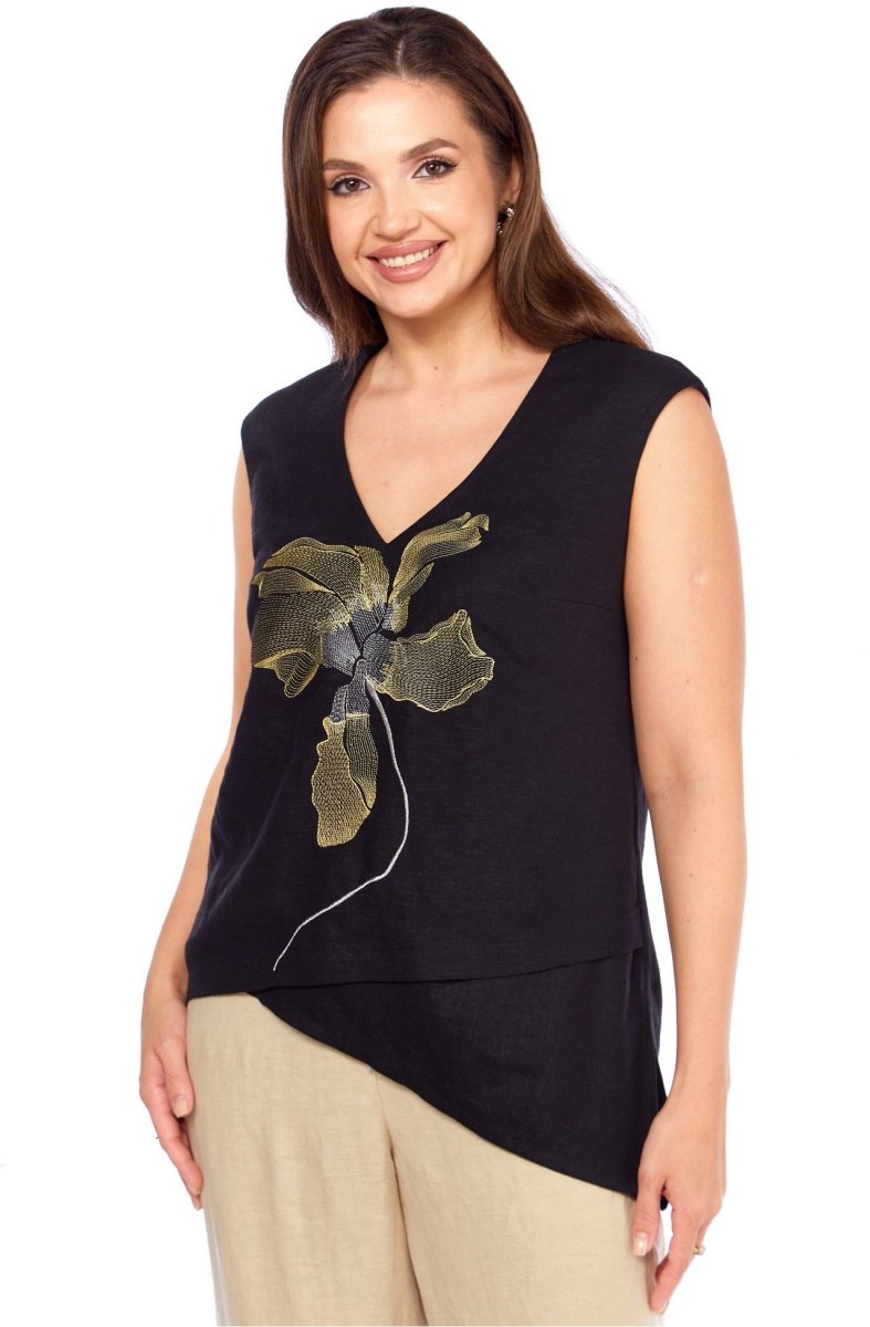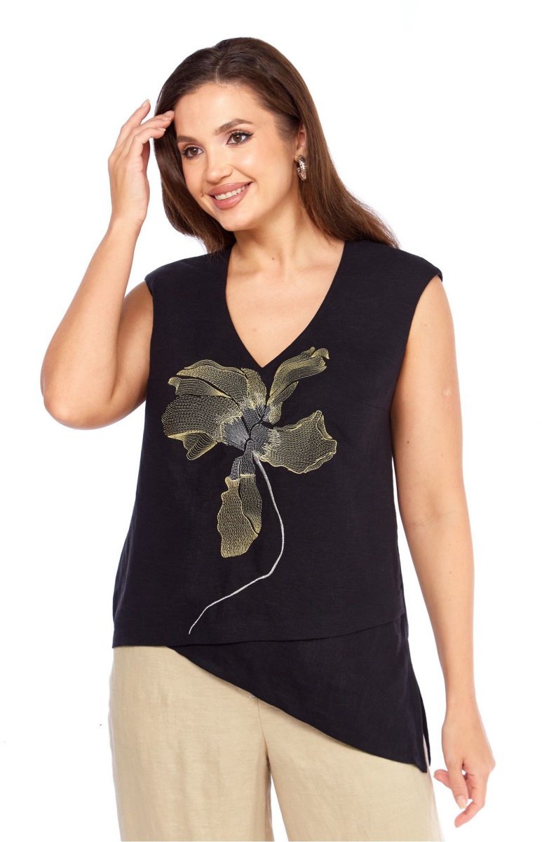 Блуза прямого силуэта. По переду нагрудные вытачки от боковых швов, декоративная вышивка. Низ ассиметричный с отрезной деталью. разрез в левом боковом шве. Плечо слегка спущено. Горловина с V- образным вырезом .