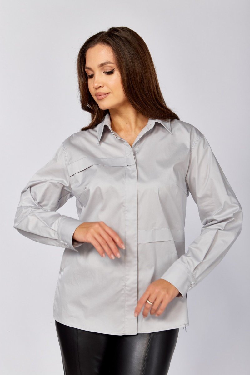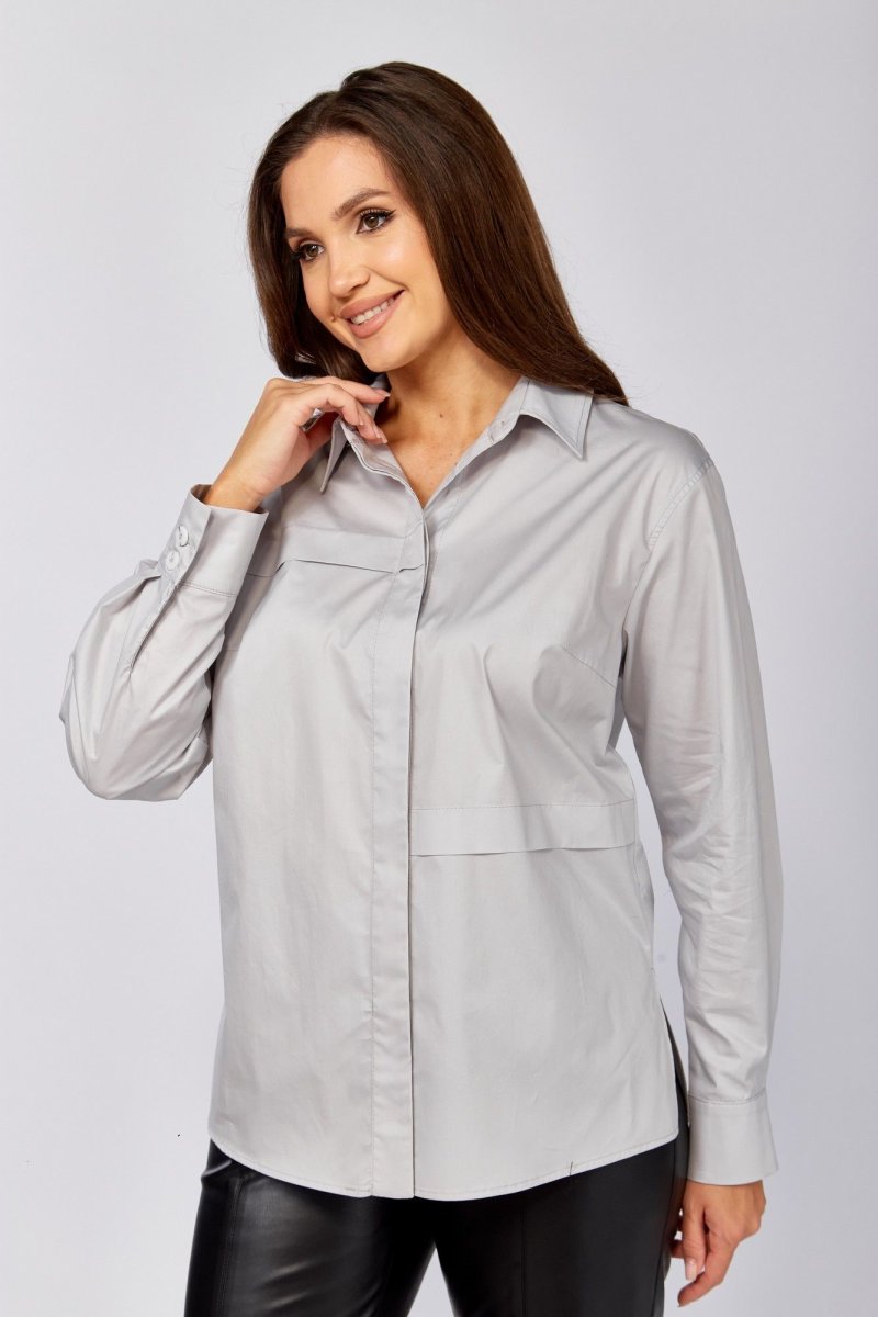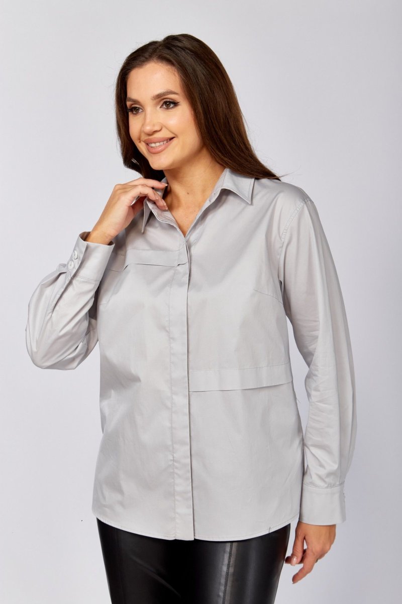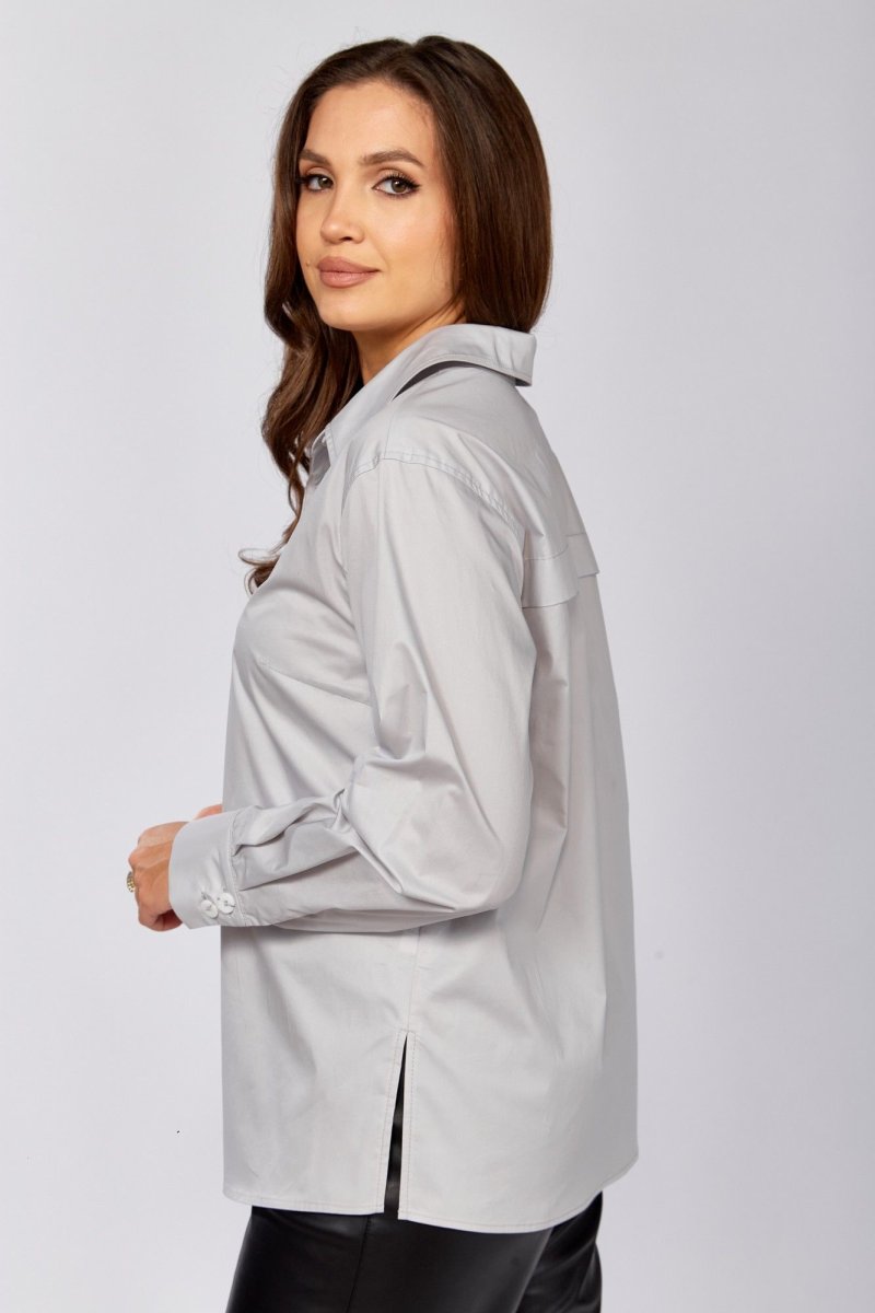 Хлопковая блузка-рубашка прямого силуэта. Рукав длинный рубашечный на манжете, воротник отложной рубашечный. По полочкам и спинке горизонтальные застроченные декоративные складки В боковых швах по низу разрезы