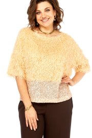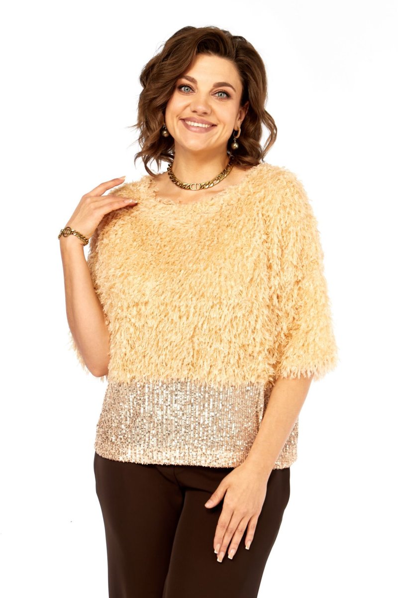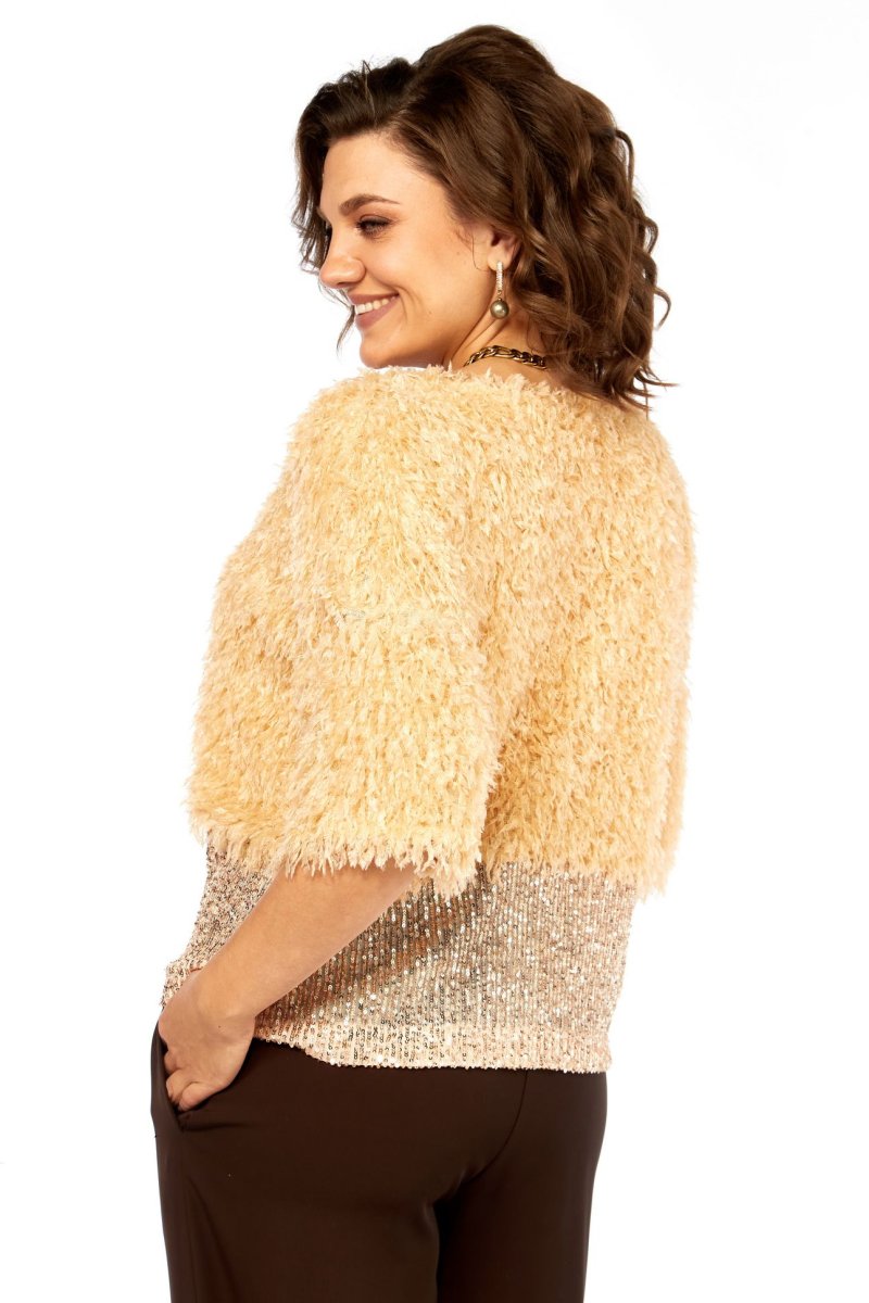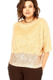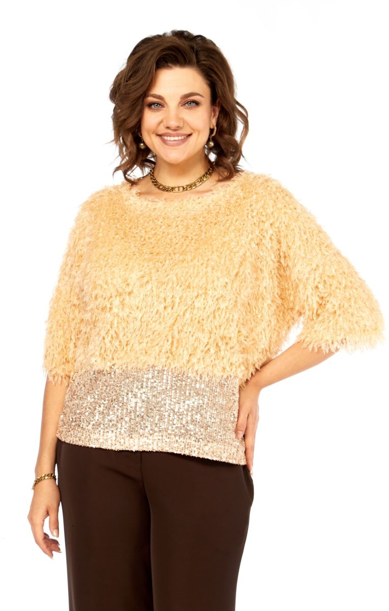 Блузка нарядная прямого силуэта, из интересной ткани с бахромой и отделкой из паеток. Вырез горловины округлой формы, со спущеныным рукавом длиной 3/4