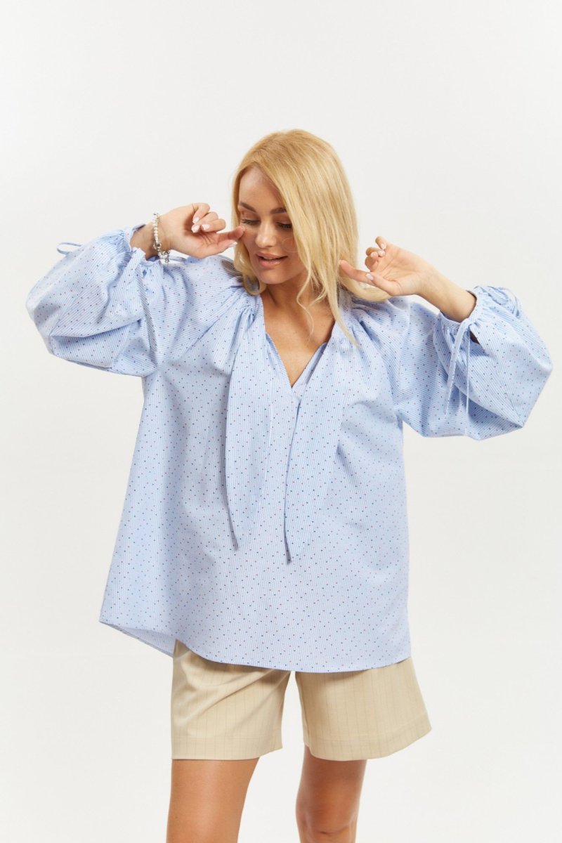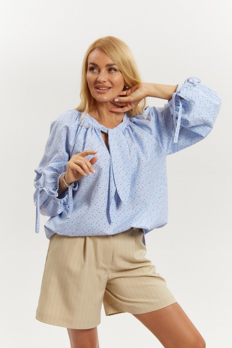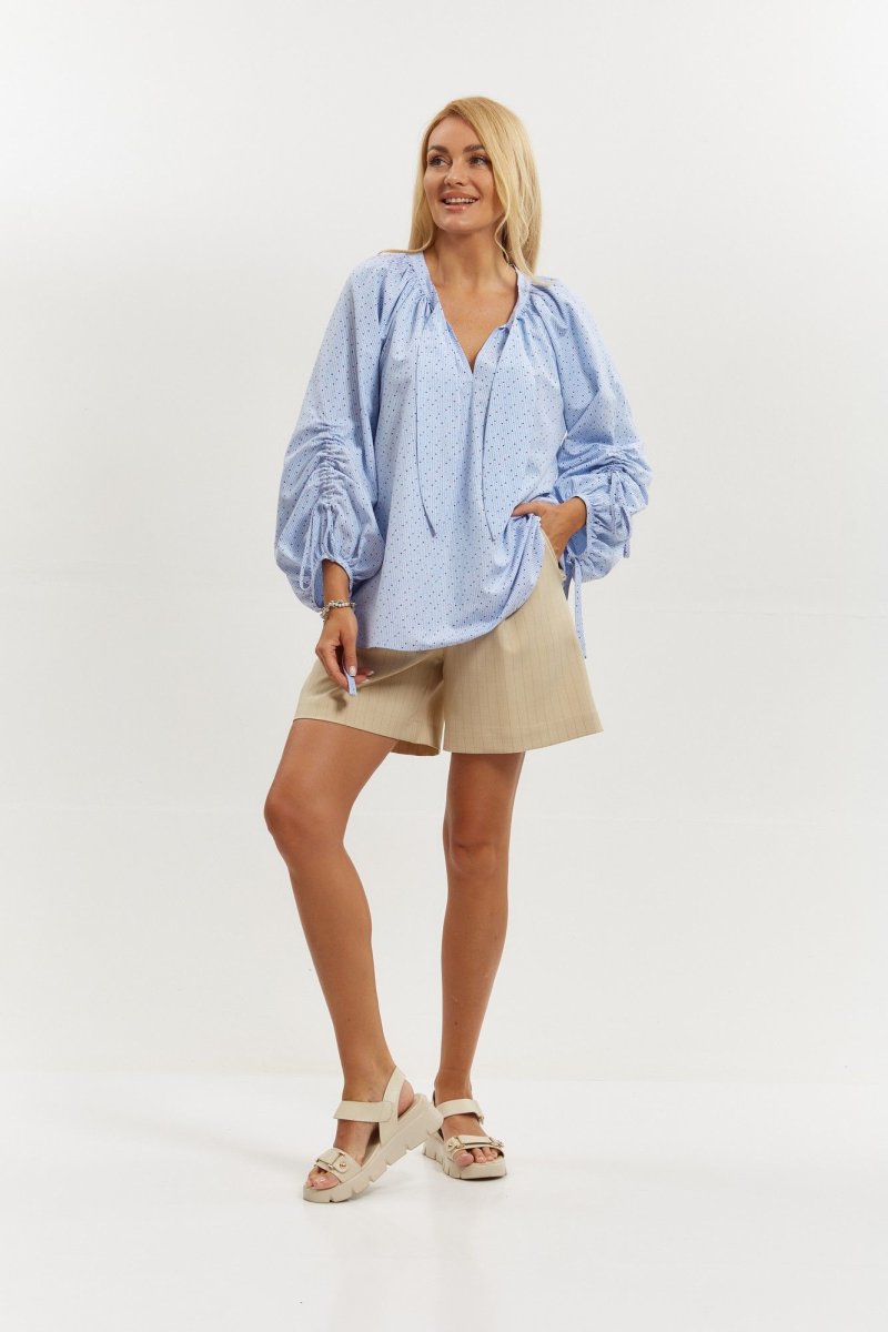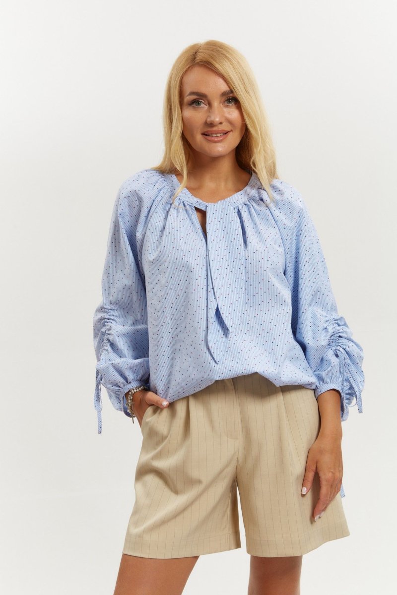 Блузка из хлопковой ткани свободного силуэта. Рукав реглан, длинный, широкий, длина регулируется интересной кулиской с завязками, низ обработан бейкой. Горловина блузки обработана широкой бейкой, переходящей в декоративные детали, которые можно завязать. В верхней части по пореду заложена сборка. Низ блузки фигурной формы.