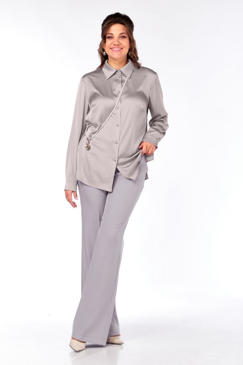 Шикарная блузка из струящейся ткани с матовым блеском, рубашечным воротником и застежкой на петли и пуговицы, нагрудными вытачками. Рукав длинный на манжете, застегивающийся на пуговицы. По боковым швам разрезы.