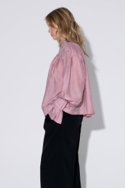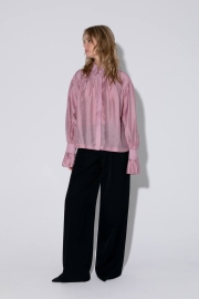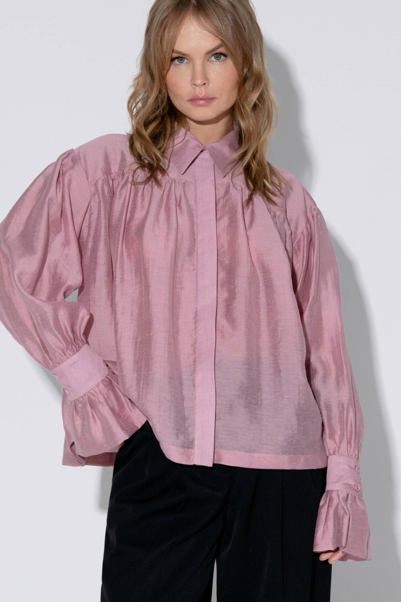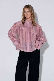 Свободная полупрозрачная блуза из вискозы. Детали: блуза трапециевидного силуэта и свободного покроя, спущенная линия плеча, кокетки переда и спинки, рубашечный воротник, потайная застежка на петли и пуговицы, рукава втачные длинные с манжетой и оборкой, блуза без подкладки. Длина по спинке около 61 см в размерах 40-46 и около 64 см в размерах 48-52, длина рукава+ плечо около 61+4 см