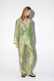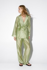 Свободная блуза в пижамном стиле из полупрозрачной вискозы. Детали: блуза прямого силуэта, застежка на петли и пуговицы, рукава втачные длинные с высокой подгибкой, съемный пояс, без подкладки. Длина по спинке около 71 см в размерах 40-46 и около 73 см в размерах 48-52. Длина рукава около 60 см.