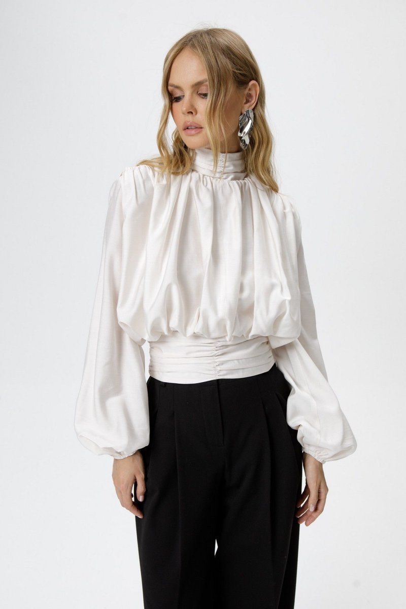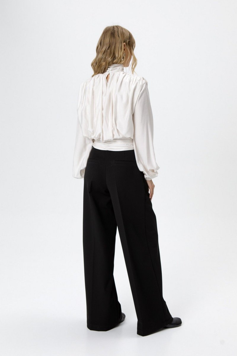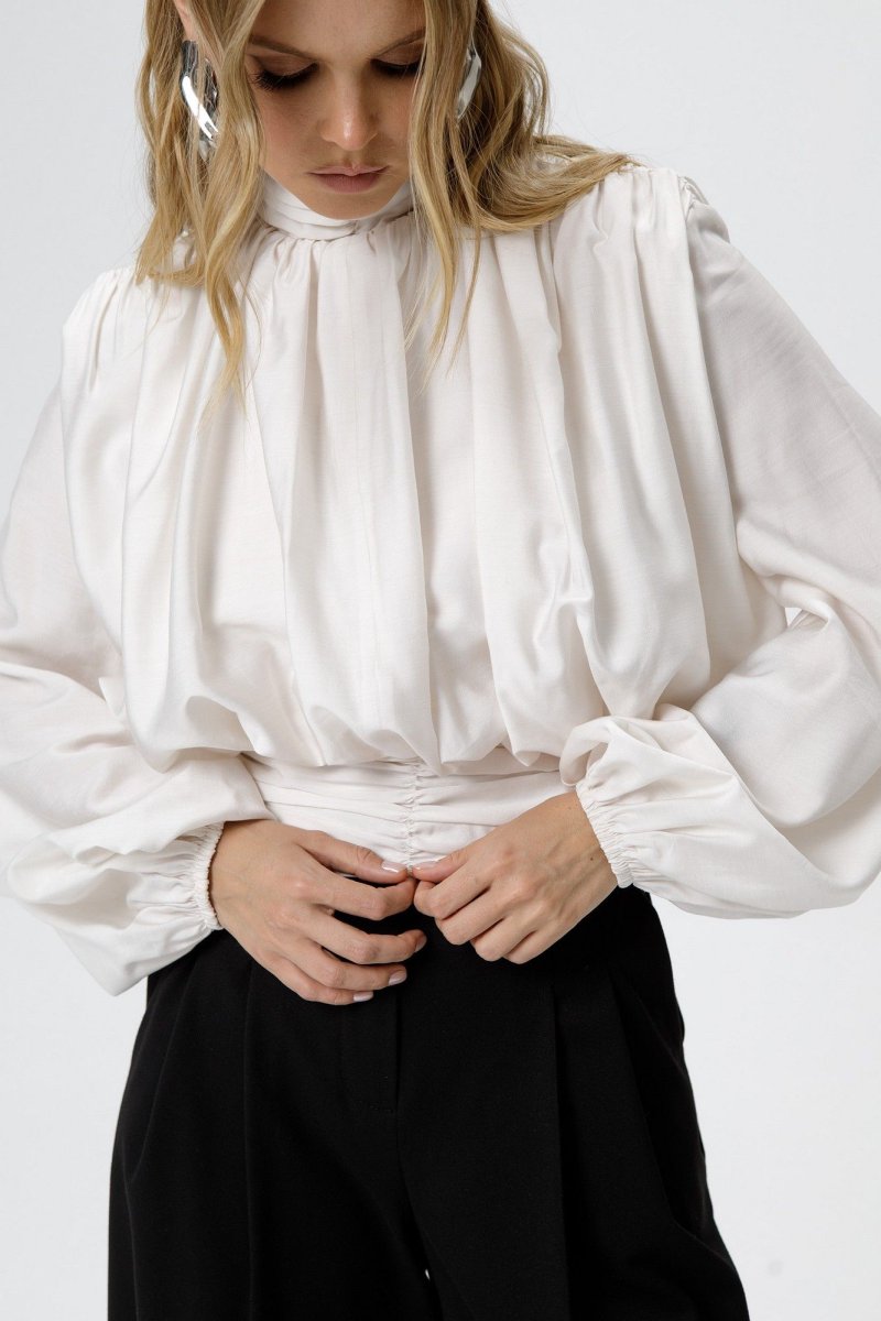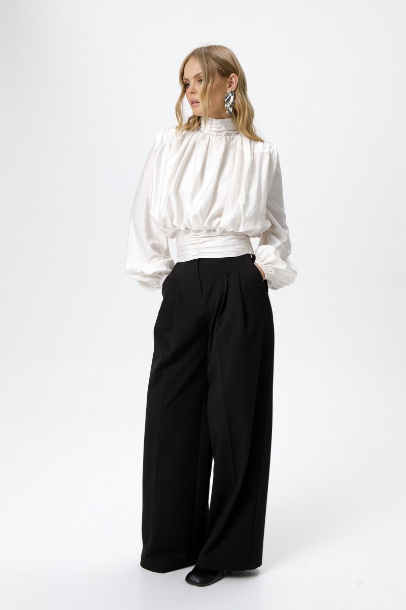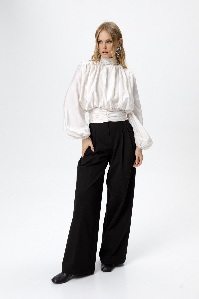 Детали: блуза приталенного силуэта, перед и спинка свободного покроя, пояс блузы со сборкой, расширенные плечи, сборки по плечам и горловине, застёжка на потайную молнию в боковом шве, воротник стойка со сборкой и застёжкой на навесные петли и пуговицы, втачные расширенные к низу рукава с резинкой по низу.
