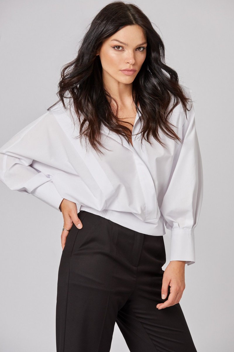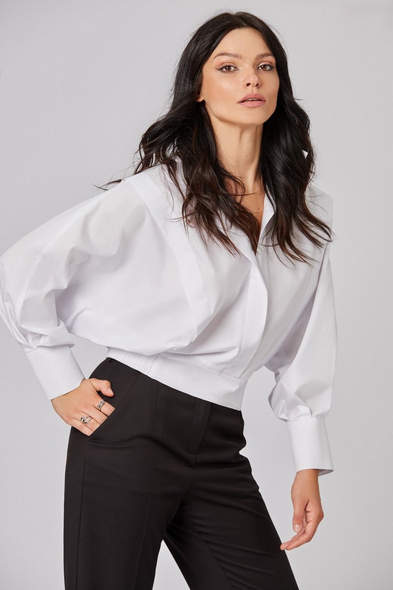 Блуза: - прямой силуэт - воротник - высокая стойка - потайная застёжка на пуговицы - вертикальные складки по переду и спинке - цельнокроеный рукав с манжетой, застежка - пуговица - низ блузы по бокам на резинке.