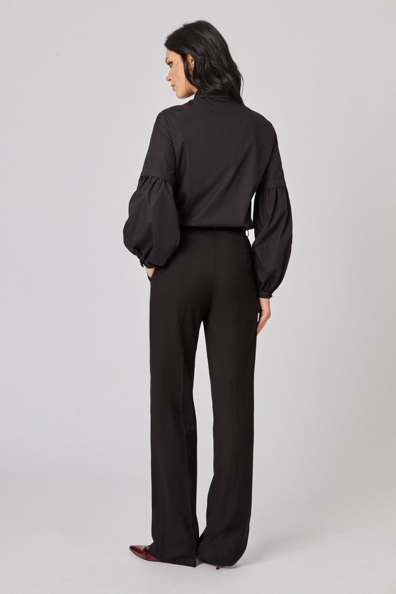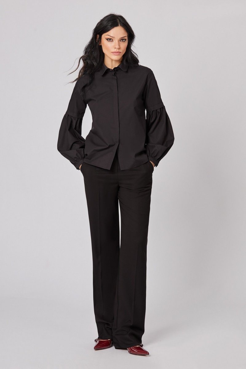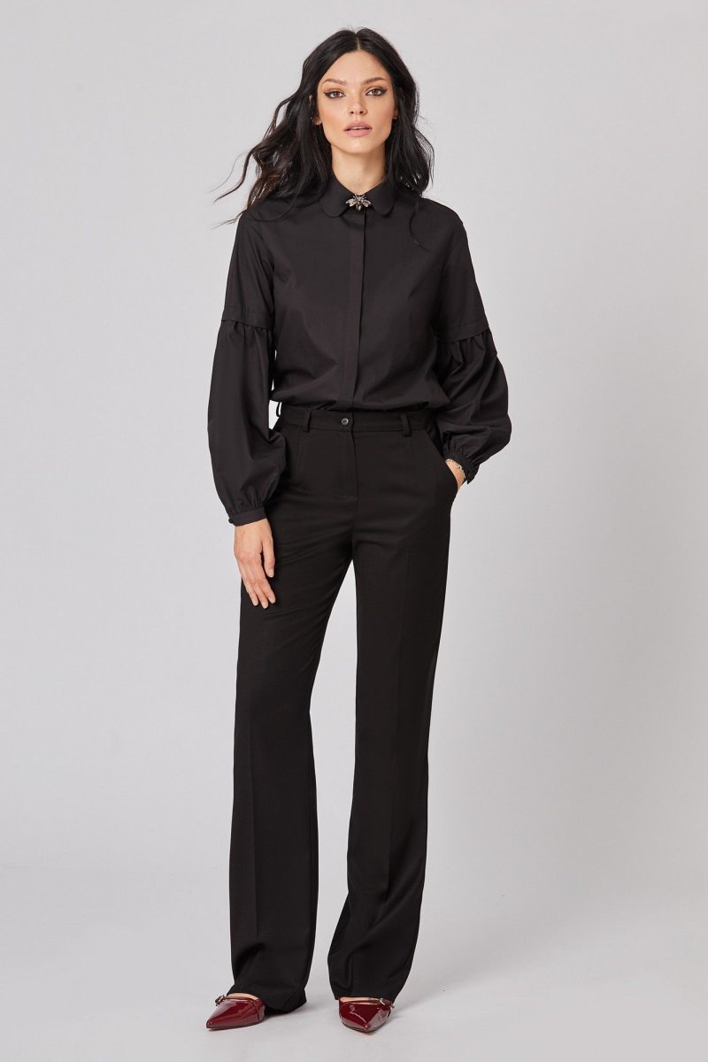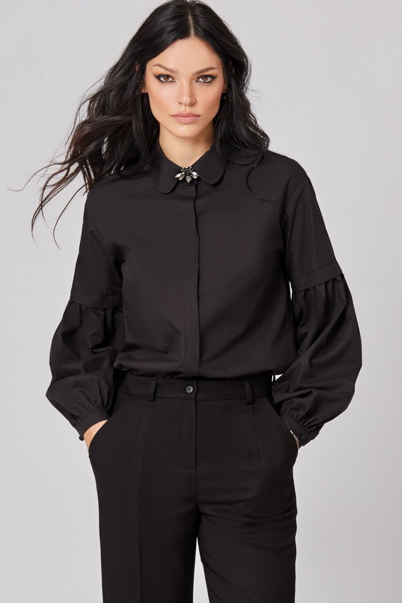 Блуза: - прямой силуэт - потайная застёжка на пуговицы - воротник рубашечный со скругленным уголком - съемная брошь в комплекте - рукав втачной, состоящий из двух частей: узкой и расширенной со сборкой - по низу рукава тонкая манжета с застёжкой на пуговицу.