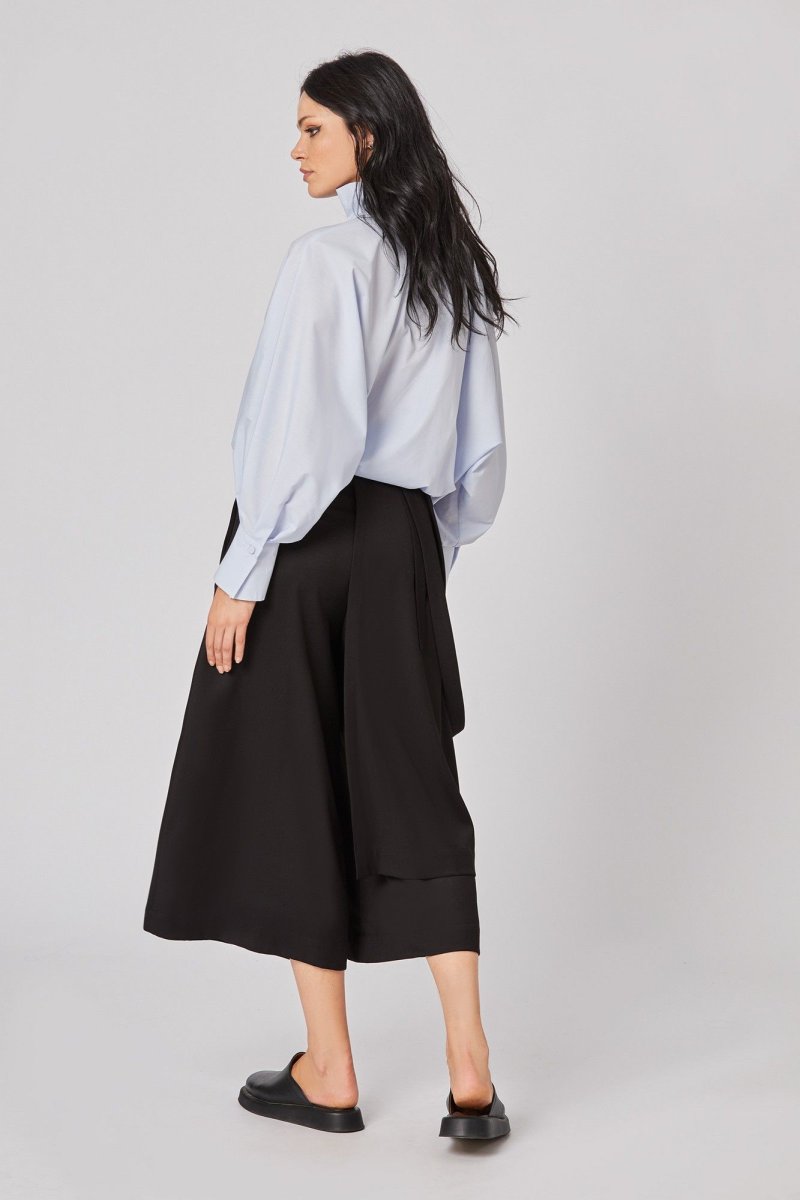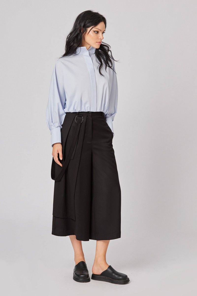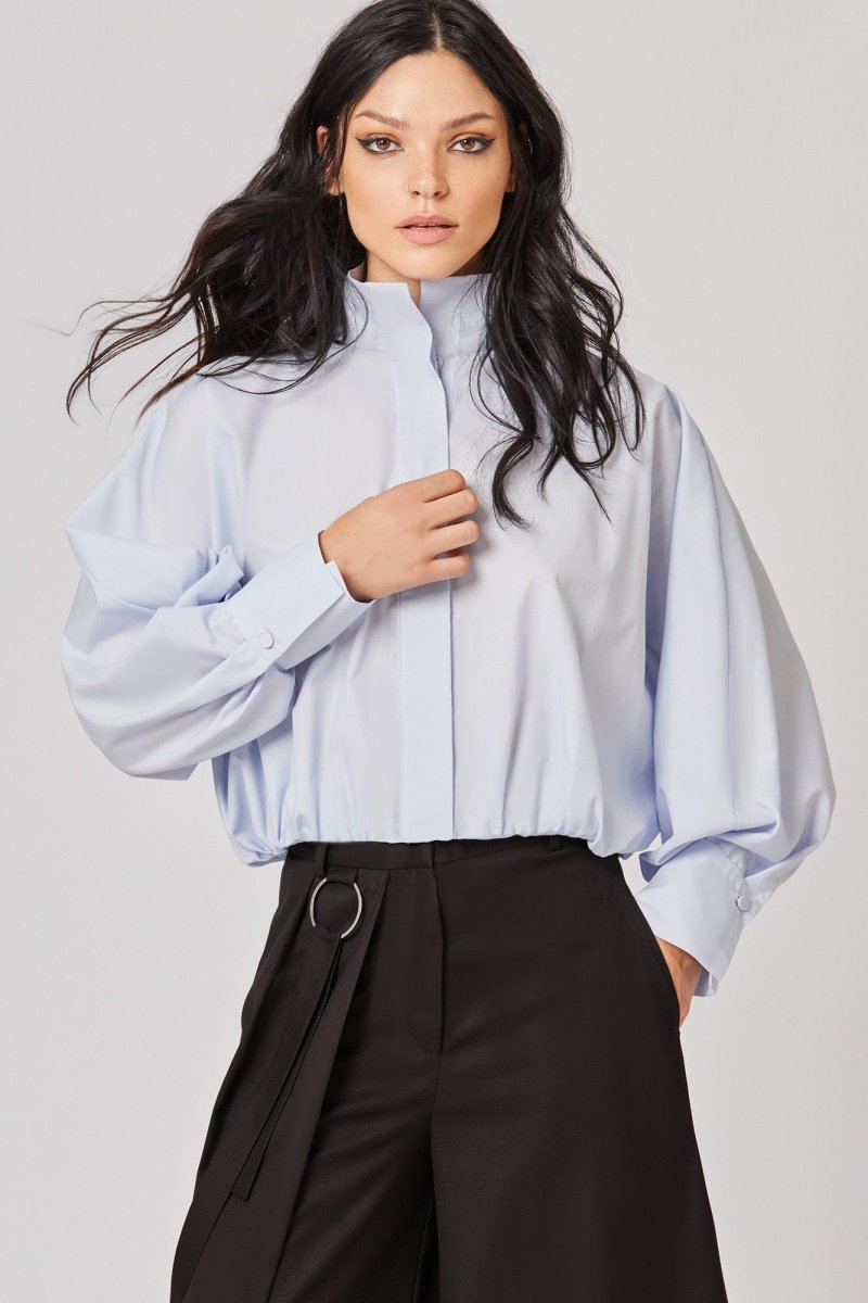 Блуза: - прямой силуэт - воротник- высокая стойка - застежка: потайная планка на пуговицах - цельнокроеный рукав с манжетой, застежка-пуговица - низ блузы по бокам на резинке.