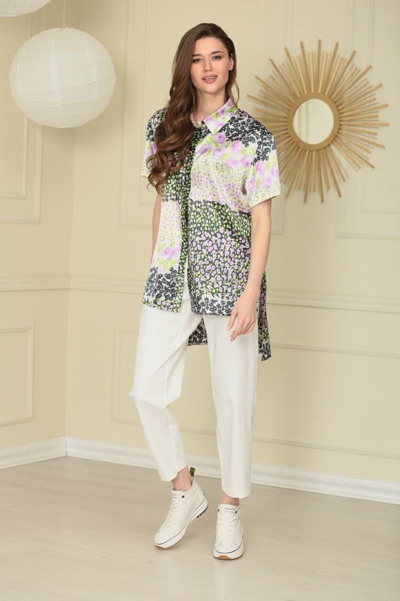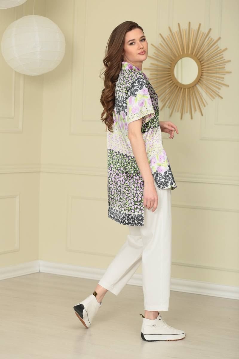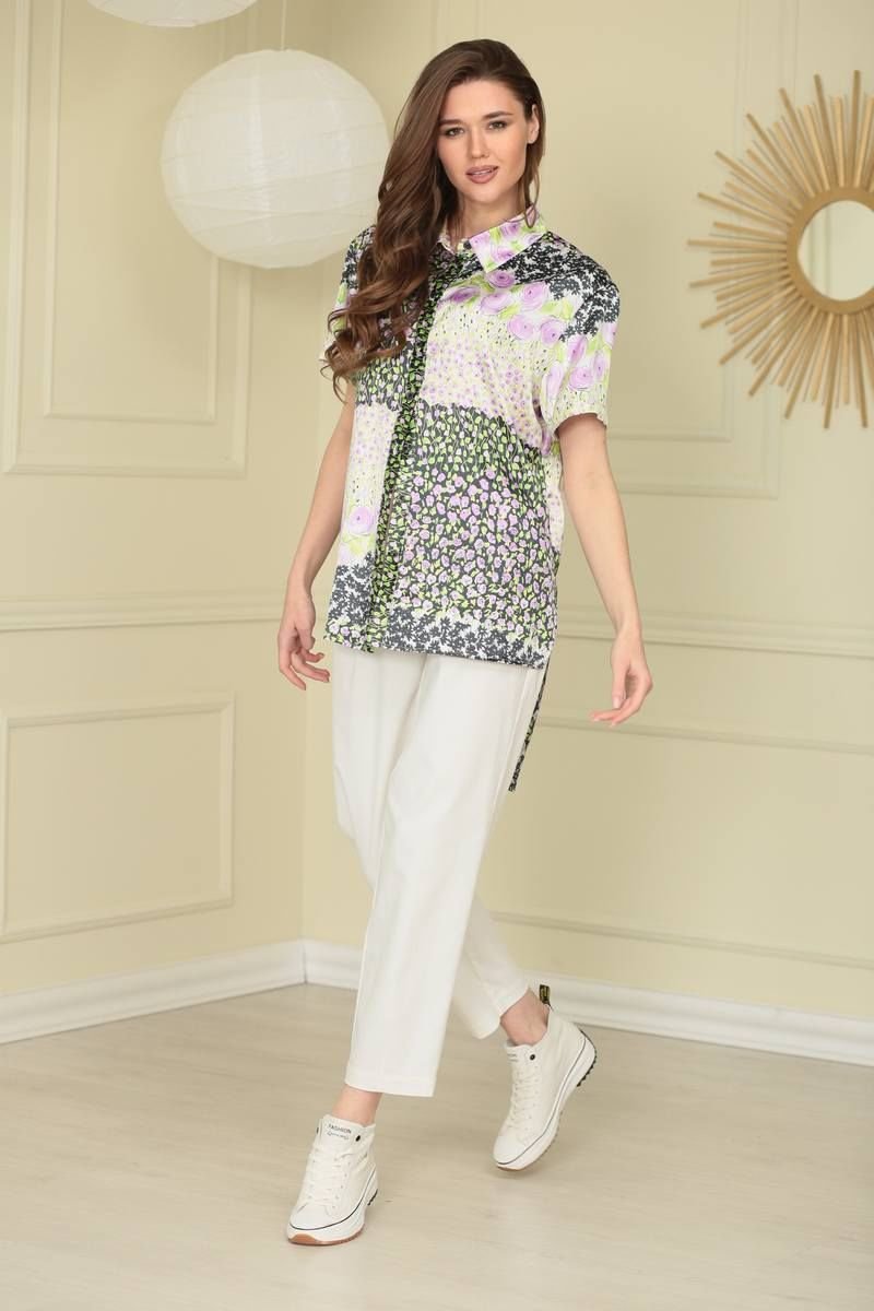 Стильная блуза прямого силуэта с коротким рукавом. Рукав со спущенной линией плеча. Горловина оформлена рубашечным воротником на стойке. застежка по центру переда на петли и пуговицы с отрезной планкой. По бокам разрезы. Низ блузки разноуравневый, по спинке-длиннее. Спинка без особенностей. Длина переда - 74 см, длина спинки - 88 см.
