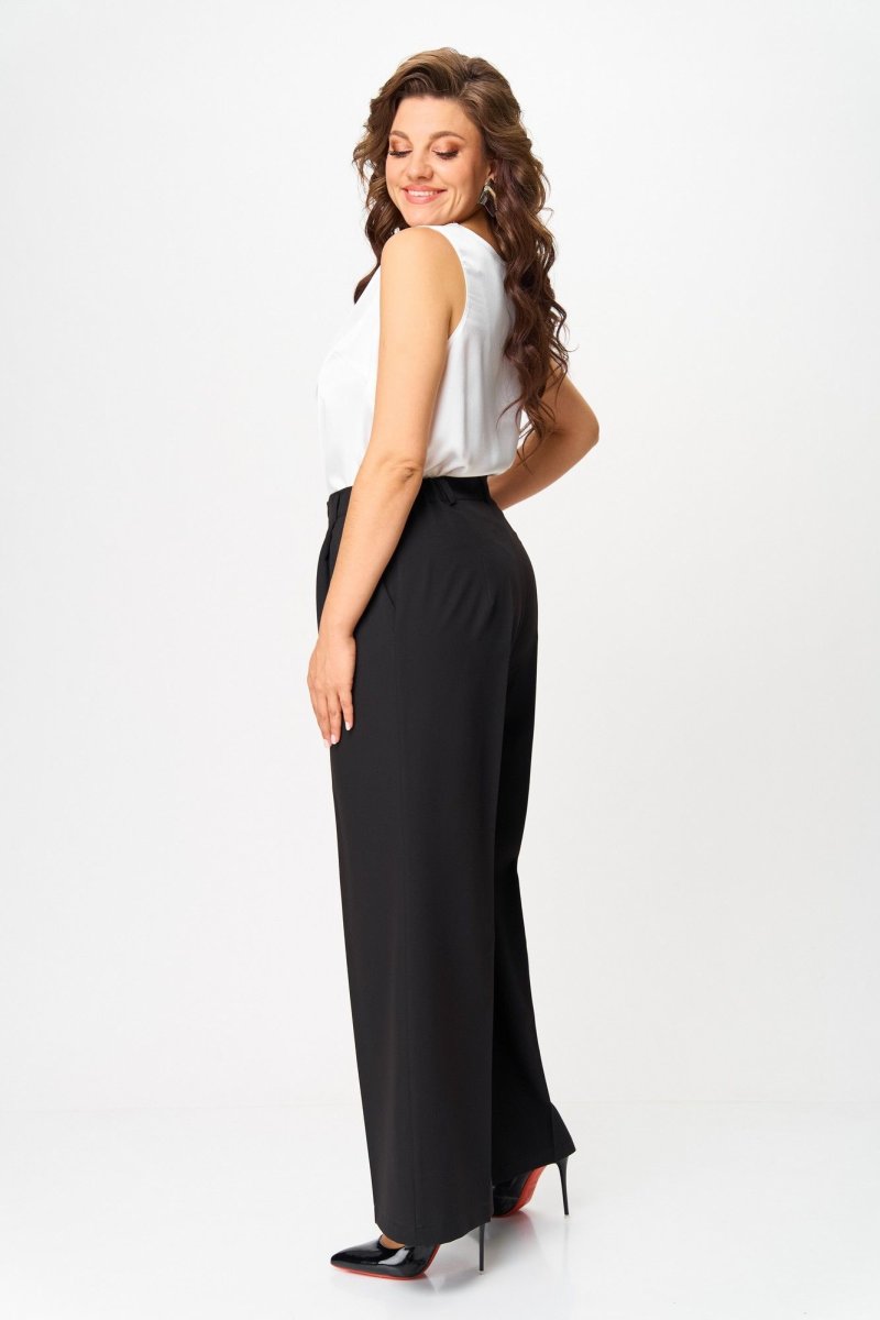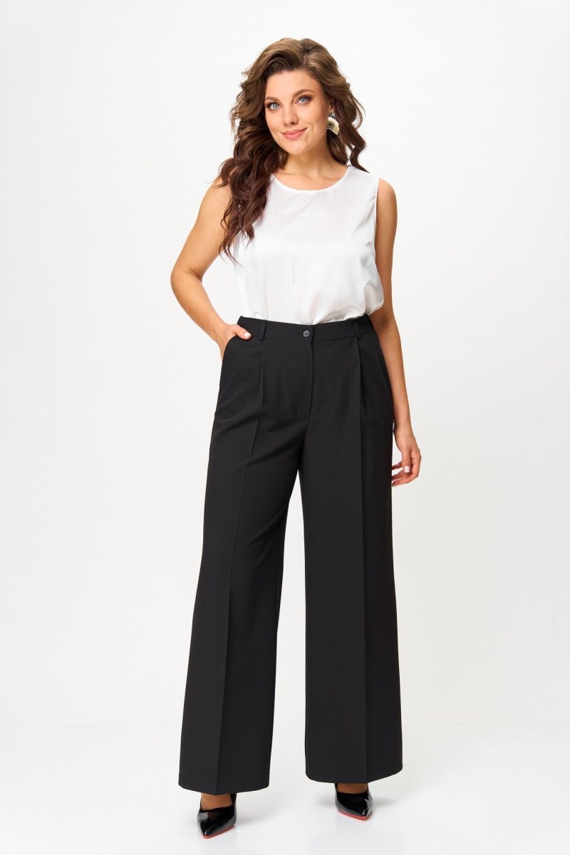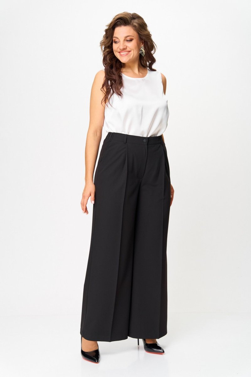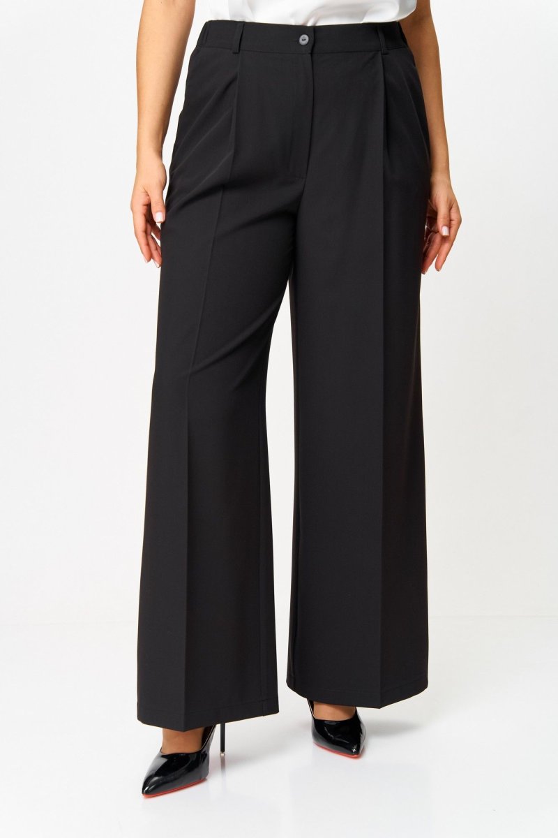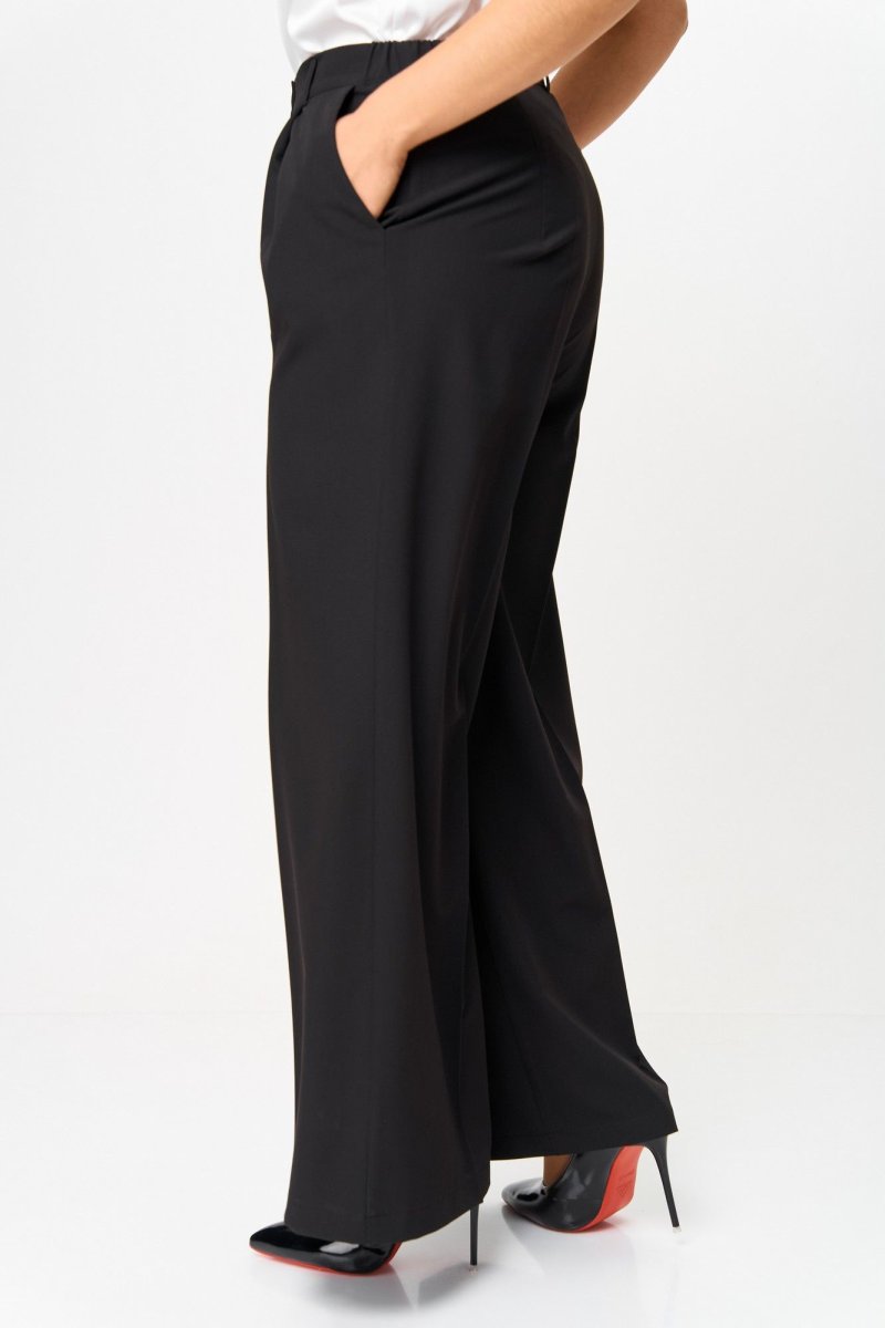 Брюки классические, со стрелками, полной длины, выполнены из однотонной ткани. В области бедер полуприлегающие, в колене и по низу прямые. По передним половинкам обработаны складки по линии талии и наклонные карманы, в среднем шве застежка на молнию. По задним половинкам обработаны талиевые вытачки. Брюки на притачном поясе с эластичной тесьмой и застежкой на петлю и пуговицу.
