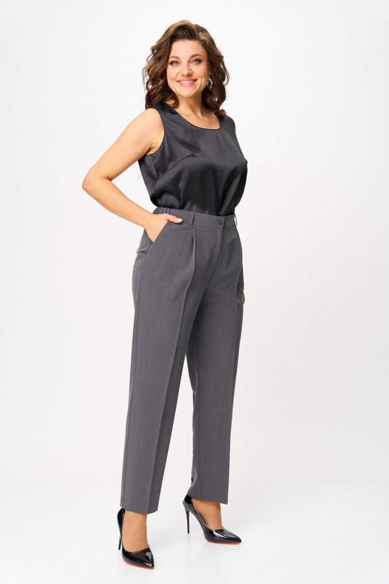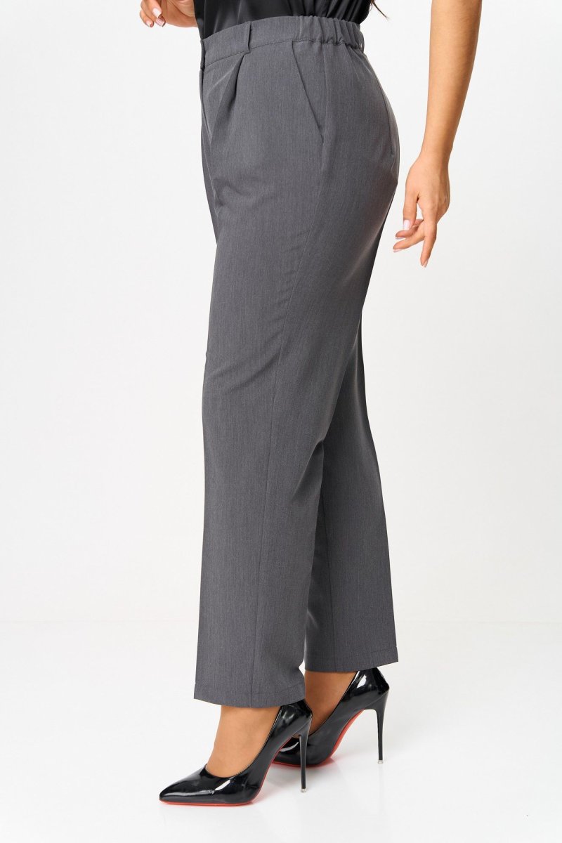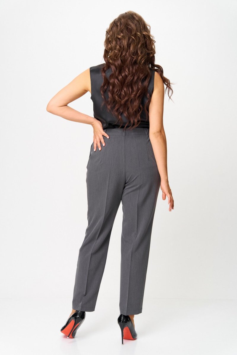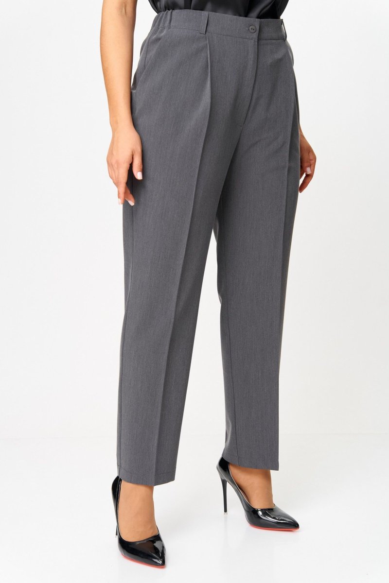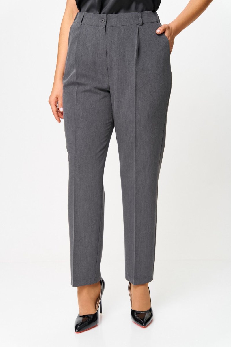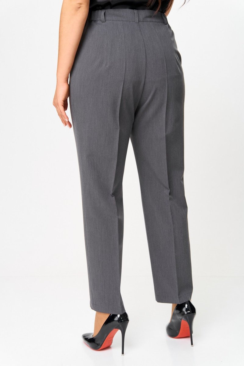Брюки классические, со стрелками, полной длины, выполнены из однотонной ткани. В области бедер полуприлегающие, в колене и по низу прямые. По передним половинкам обработаны складки по линии талии и наклонные карманы, в среднем шве застежка на молнию. По задним половинкам обработаны талиевые вытачки. Брюки на притачном поясе с эластичной тесьмой и застежкой на петлю и пуговицу.