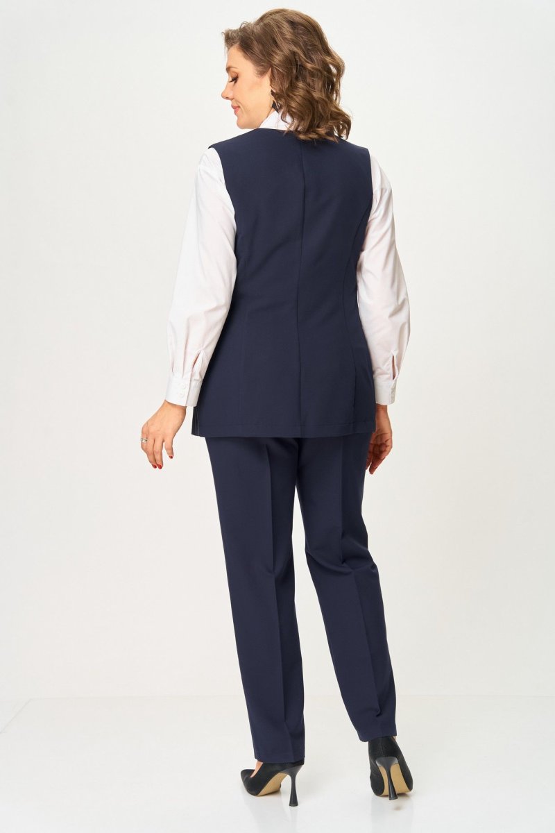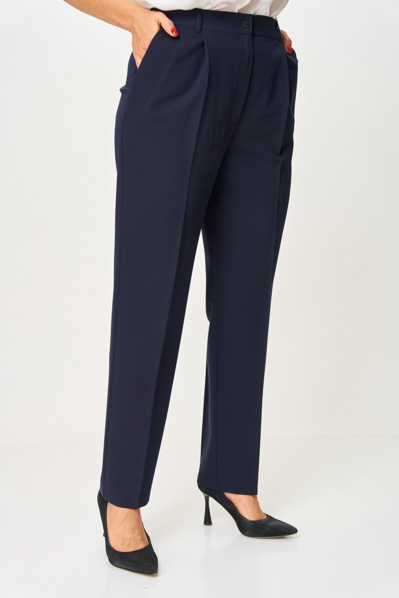 Брюки классические, со стрелками, полной длины, выполнены из однотонной ткани. В области бедер полуприлегающие, в колене и по низу прямые. По передним половинкам обработаны складки по линии талии и наклонные карманы, в среднем шве застежка на молнию. По задним половинкам обработаны талиевые вытачки. Брюки на притачном поясе с эластичной тесьмой и застежкой на петлю и пуговицу.