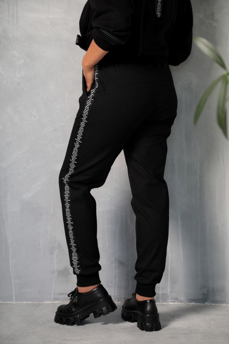 Стильные брюки-джоггеры свободного кроя, с высокой посадкой, с широким поясом из хлопкового трикотажного полотна и тканым шнуром. Незаменимая модель брюк из хлопковой джинсовой ткани, для Вашего комфортного времяпровождения. По боковым швам настрочена декоративная лента, а так же имеются карманы «Хулиганы». Отрезная кокетка на задней части брюк делает их посадку идеальной. Все манжеты обработаны хлопковым трикотажным полотном с фактурой в стиле «Английской резинки».