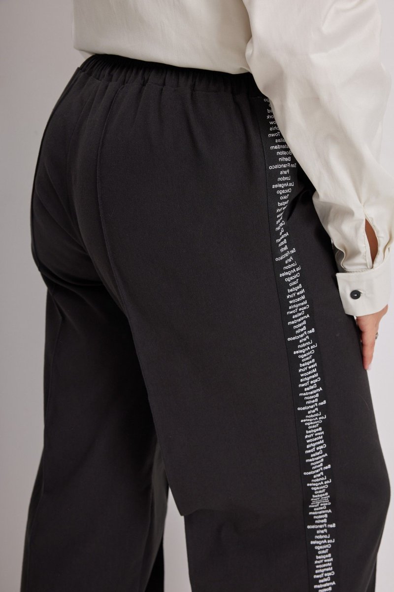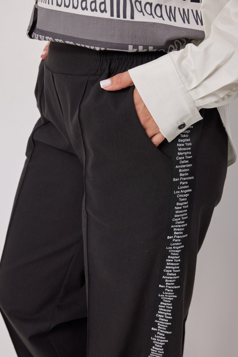 Брюки свободного кроя из тактильно приятной растяжимой джинсовой ткани - это модель которая необходима в гардеробе каждой модницы. Изюминка данной модели - настроченные декоративные ленты с текстовым принтом, что позволяет удлинить ножки благодаря акцентной вертикали в виде лент.