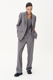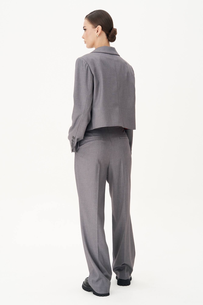Брюки классического кроя с высокой посадкой на притачном поясе со шлёвками. Застежка брючная на потайной крючок и молнию. Передние половинки брюк с мягкой складкой-защипом и наклонными боковыми карманами. Задние половинки брюк с талиевыми вытачками и прорезными карманами с листочками. Длина брюк около 105 см.