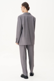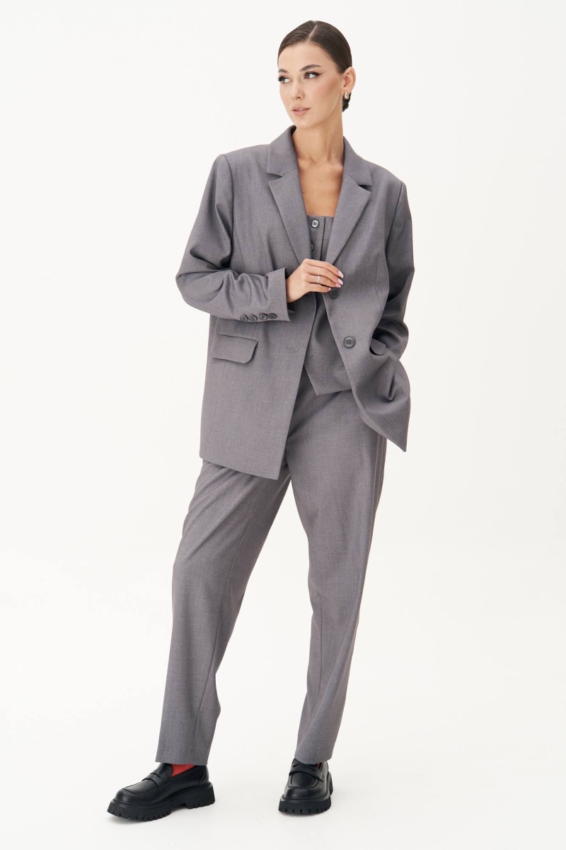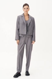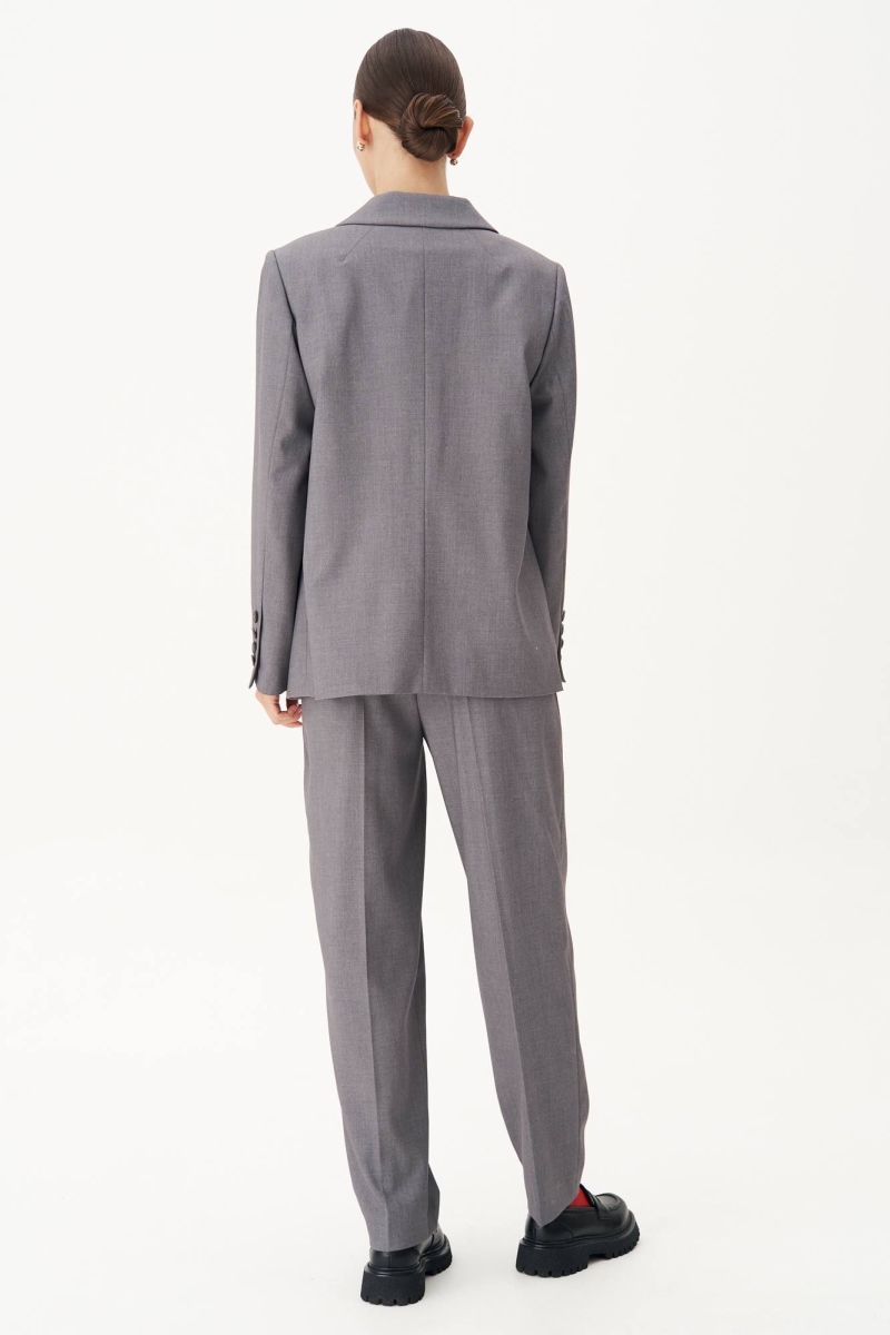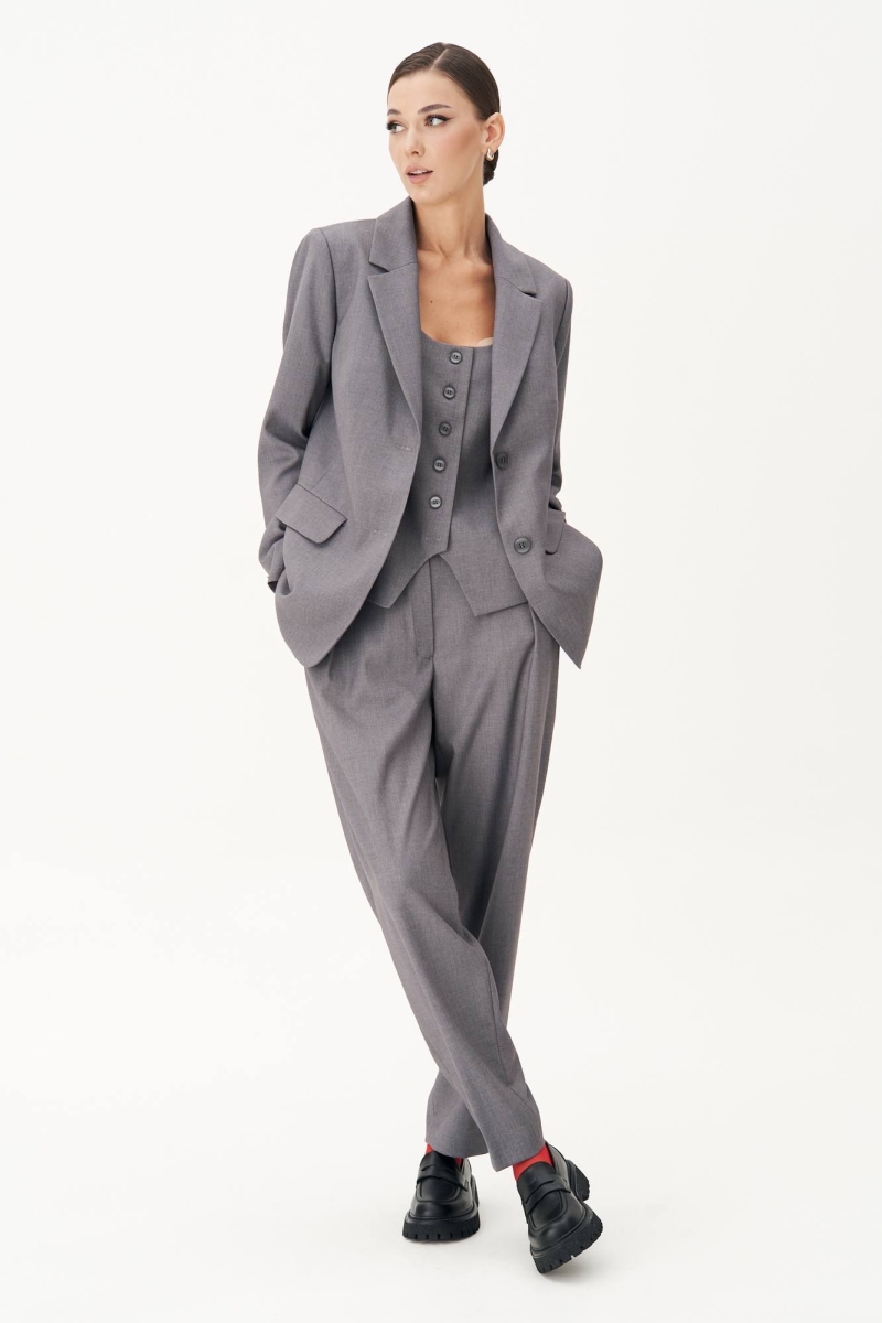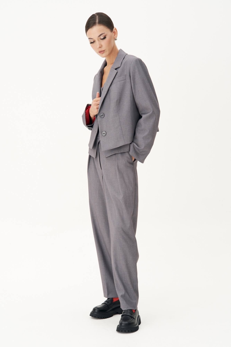 Брюки классического покроя с высокой посадкой на притачном поясе со шлёвками, зауженные. Застежка брючная на потайной крючок и молнию. Передние половинки брюк с мягкими складками защипами и наклонными боковыми карманами. Задние половинки брюк с вытачками и прорезными карманами с листочками. Длина брюк около 100 см.
