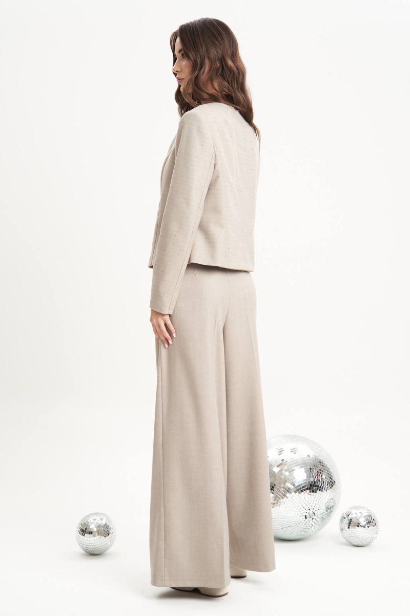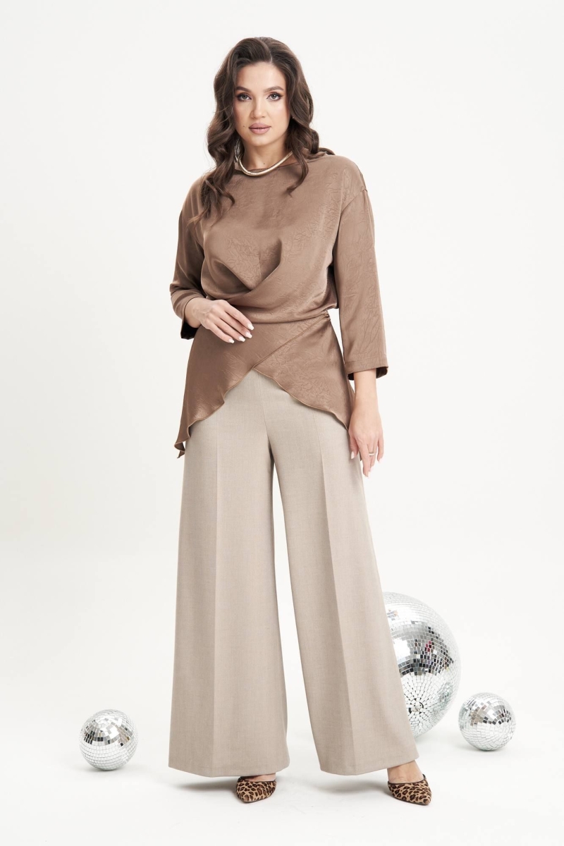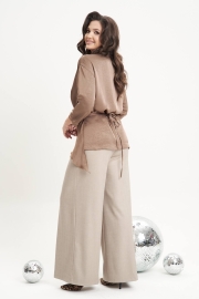 Костюмный тренд - это максимум стиля и практичности, особенно если носить их в неформальной обстановке. Это настоящий casual-шик, который легко трансформируется в вечерний образ. Брюки-палаццо широкие внизу и прилегающие вверху, с талиевыми вытачками по передним и задним половинкам. Застёжка по боковому шву. Длина брюк около 108 см. На фото с жакетом 4982
