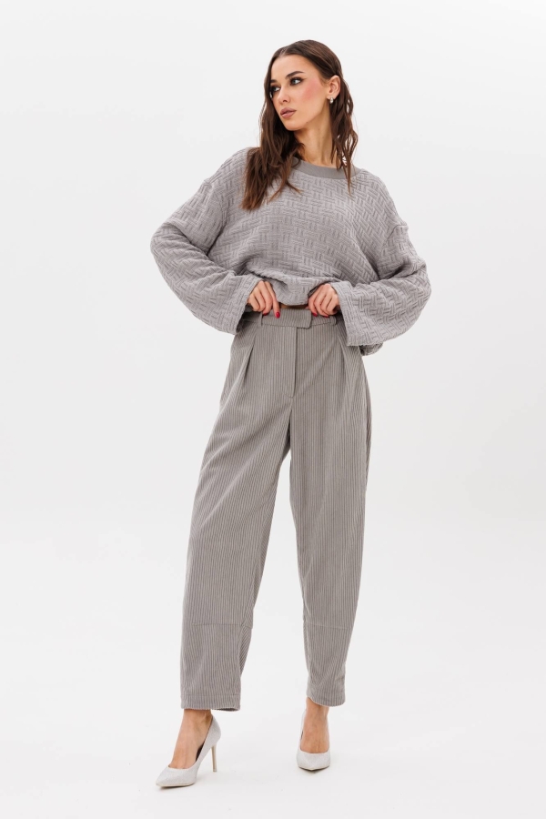 Брюки "баррел" на притачном поясе со шлёвками (эластичном в области спинки), с наклонными карманами , мягкими складками защипами по верху брюк.
