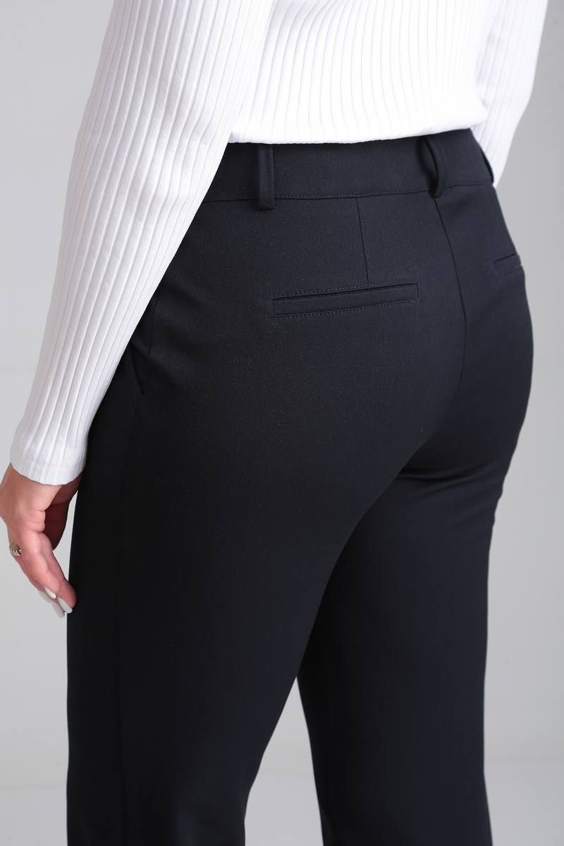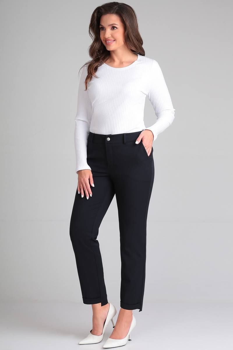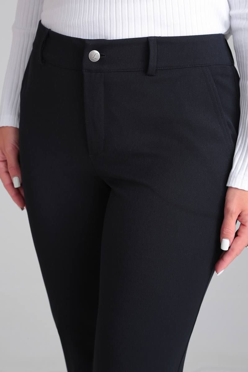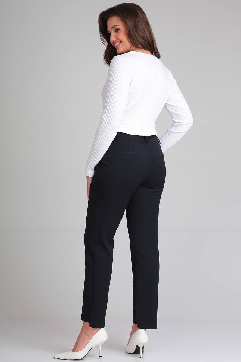 Брюки укороченные, на притачном поясе имеются шлевки. Застёжка на молнию и джинсовую пуговицу. По переду изделия расположены функциональные боковые карманы с декоративной отстрочкой, по задним половинкам карманы-обманки с листочкой. Низ изделия ассиметричный-передние половинки брюк короче, а задние половинки длиннее. Эти удобные брюки - отличный вариант для повседневной носки