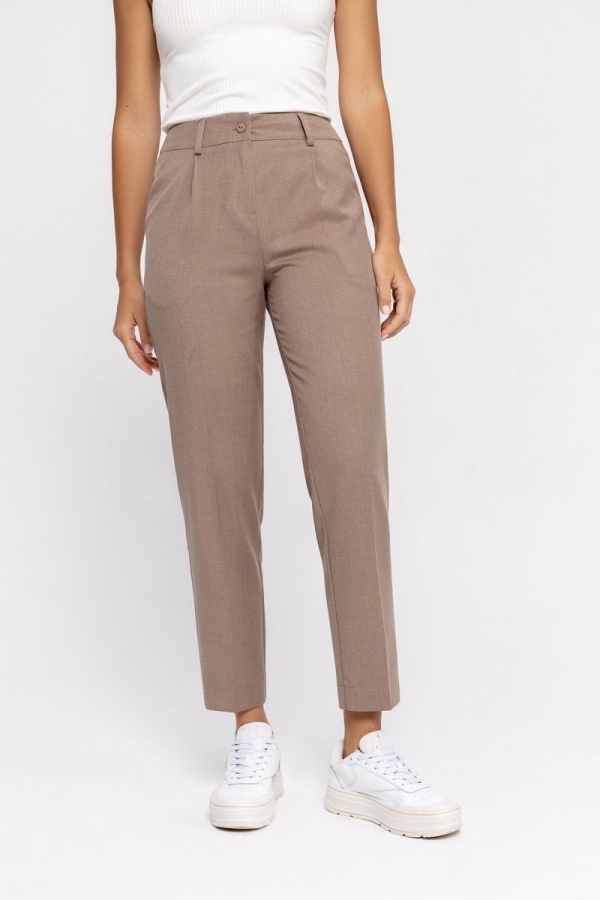 Классические укороченные брюки из текстильной ткани. Детали: брюки со средней посадкой, притачной пояс со шлевками, передние половины с небольшими мягкими складками и заутюженными стрелками, застежка на молнию и пуговицу, боковые карманы. Длина по боковому шву с поясом около 94 в размерах 40-46 и около 95,5 см в размерах 48-52 Длина по внутреннему шву около 67 см