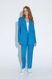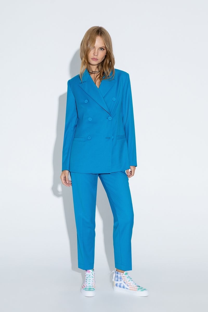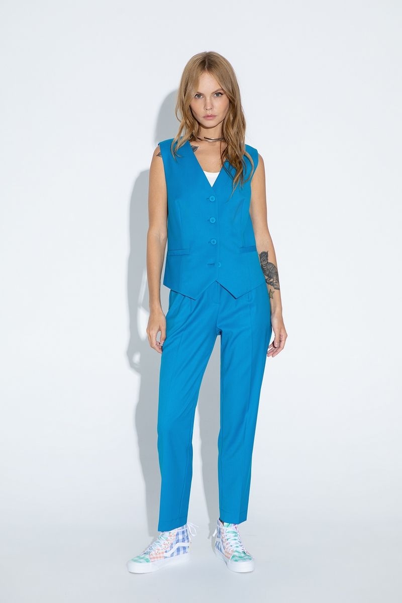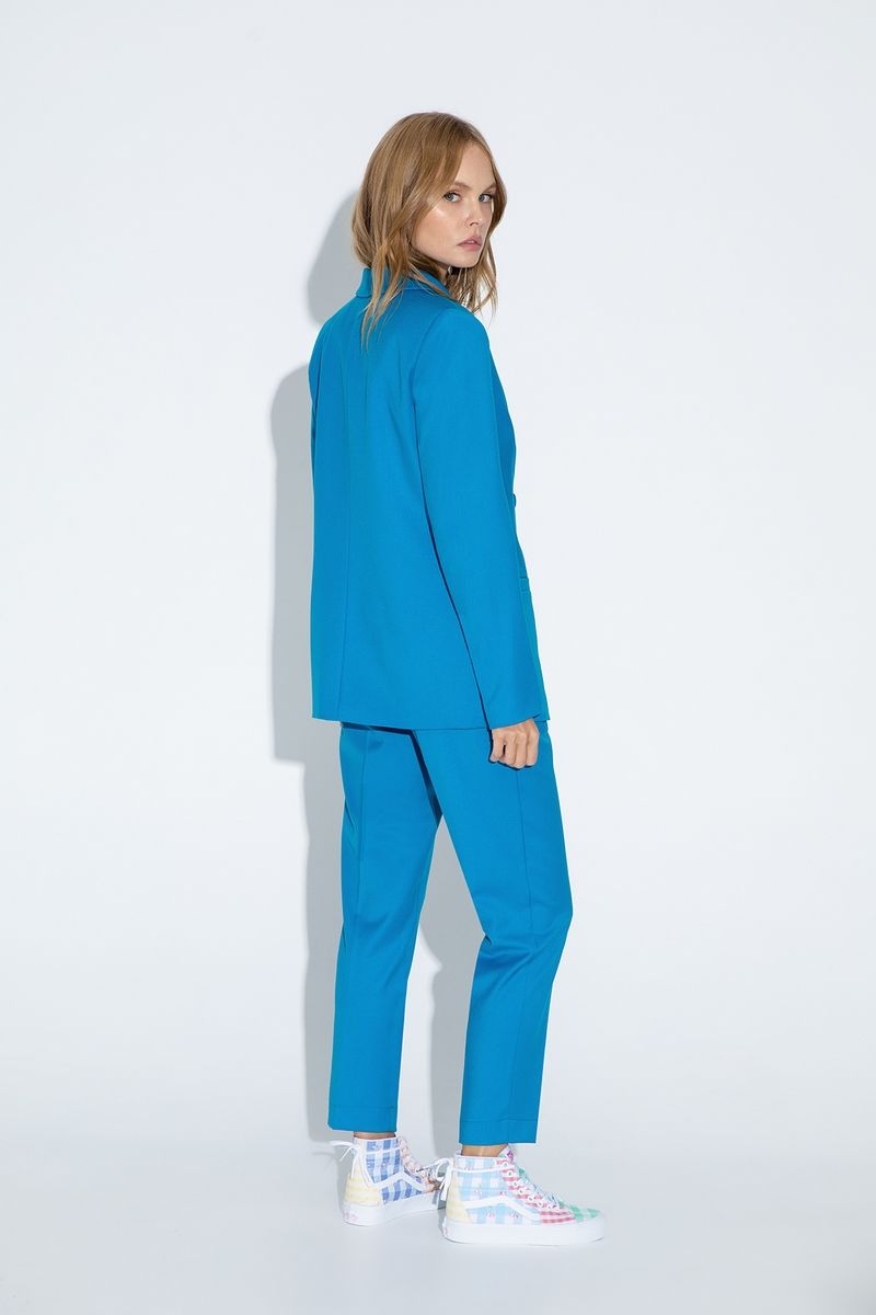 Классические укороченные брюки из текстильной ткани. Детали: брюки со средней посадкой, притачной пояс со шлевками, передние половины с небольшими мягкими складками и заутюженными стрелками, застежка на молнию и пуговицу, боковые карманы. Длина по боковому шву с поясом около 94 в размерах 40-46 и около 95,5 см в размерах 48-52 Длина по внутреннему шву около 67 см