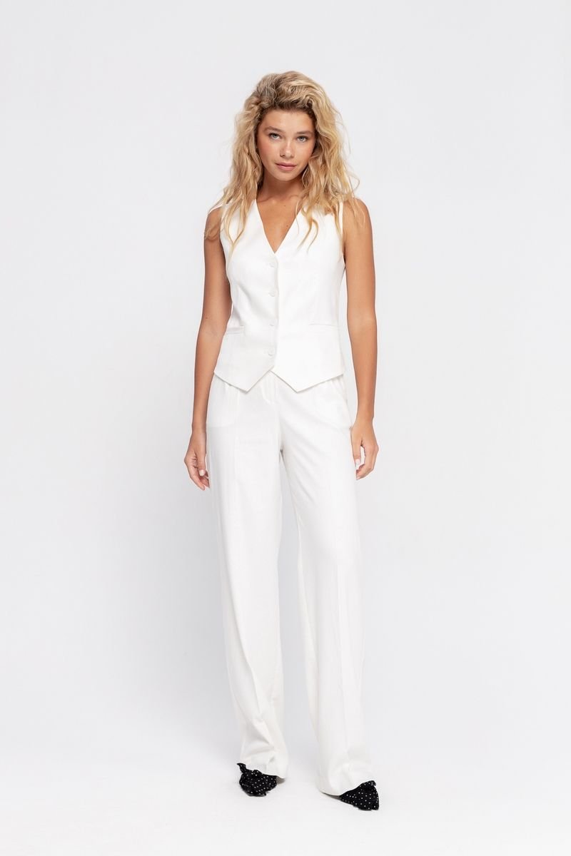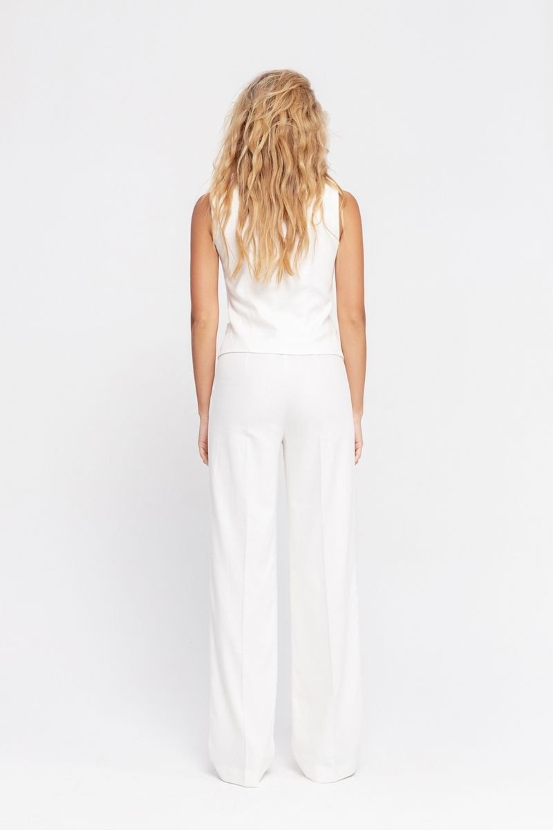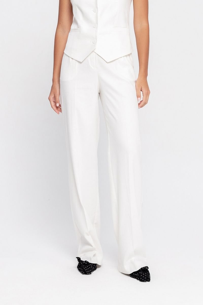 Брюки-палаццо из смесового льна Детали: брюки с высокой посадкой на притачном поясе со шлевками, застежка на молнию и пуговицу, боковые карманы, передние половины с заутюженными стрелками и двумя небольшими складками Длина по боковому шву с поясом около 113 см в размерах 40-46 и около 114,5 см в размерах 48-52, длина по внутреннему шву около 82 см