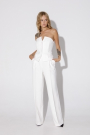 Текстильные прямые брюки-палаццо со стрелками. Детали: брюки с высокой посадкой на притачном поясе со шлевками, застежка на молнию и пуговицу, боковые карманы, передние половины с заутюженными стрелками и двумя небольшими складками. Длина брюк по боковому шву с поясом около 113 см в размерах 40-46 и около 114,5 см в размерах 48-52, длина по внутреннему шву около 82 см.