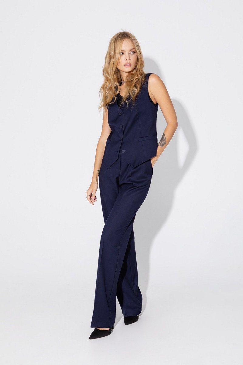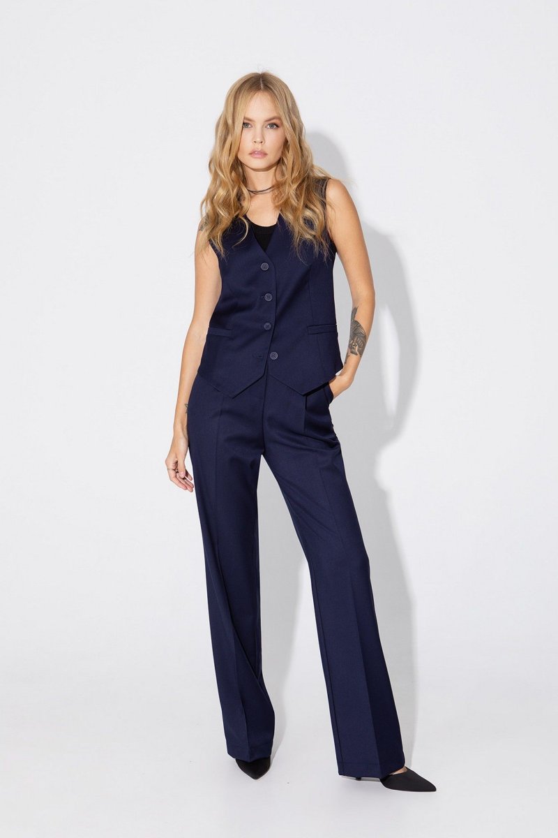 Текстильный прямые брюки с высокой посадкой. Детали: брюки на притачном поясе со шлевками, передние половины с небольшими мягкими складками и заутюженными стрелками, застежка на молнию и пуговицу, боковые карманы. Длина брюк по боковому шву с поясом около 112,5 в размерах 40-46 и около 114 см в размерах 48-52, длина по внутреннему шву около 80 см.