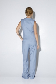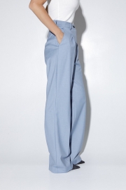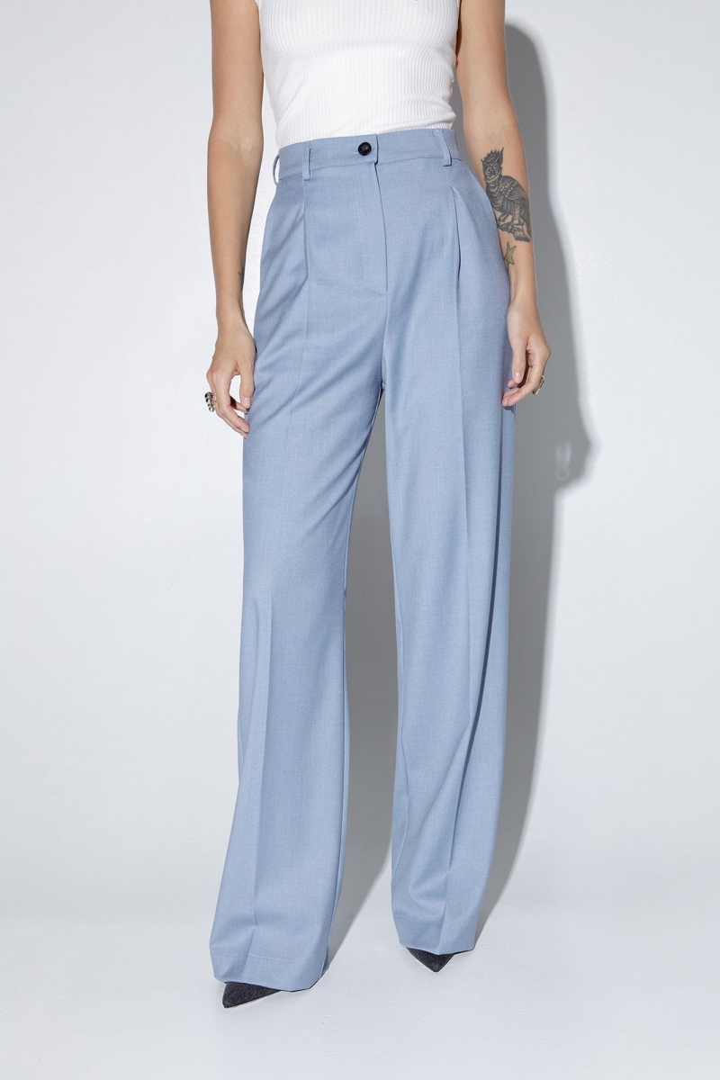 Широкие прямые брюки с высокой посадкой. Детали: притачной пояс со шлевками, передние половины с небольшими застроченными мягкими складками и заутюженными стрелками, застежка на молнию и пуговицу, боковые карманы. Задние части брюк с вытачками и заутюженными стрелками. Пояс брюк прямой, без резинки. Длина брюк по боковому шву с поясом около 114 в размерах 40-46 и около 115,5 см в размерах 48-52. Длина по внутреннему шву около 83 см
