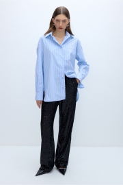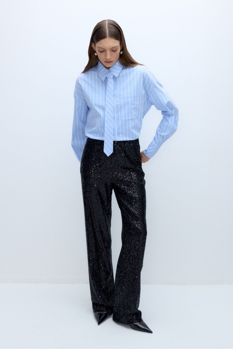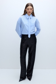 Детали: брюки с высокой посадкой на притачном поясе с резинкой, боковые карманы, на подкладке. Длина по боковому шву около 110 см в размерах 40-46 и около 112,5 см в размерах 48-52. Длина по внутреннему шву около 78 см. Состав: 100% полиэстер, подкладка- 55% вискоза 45% полиэстер