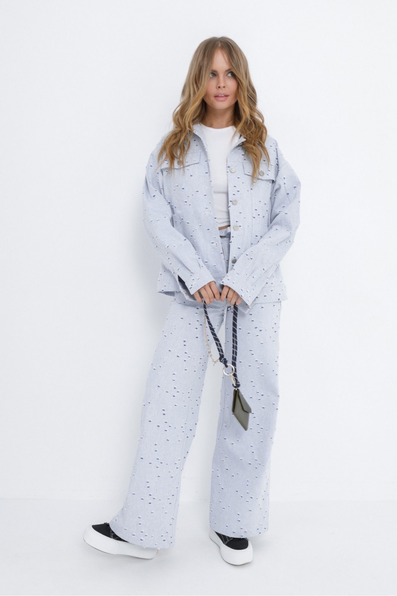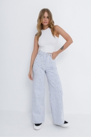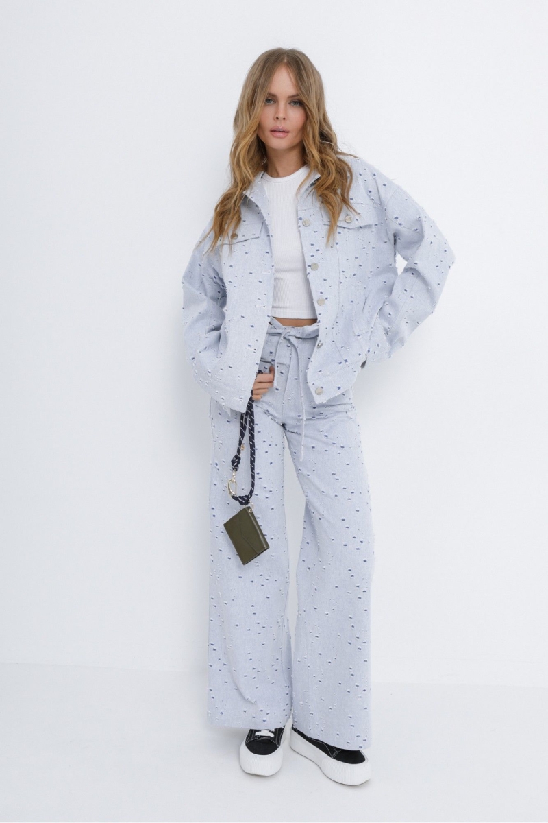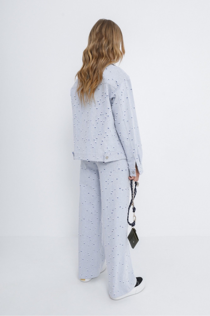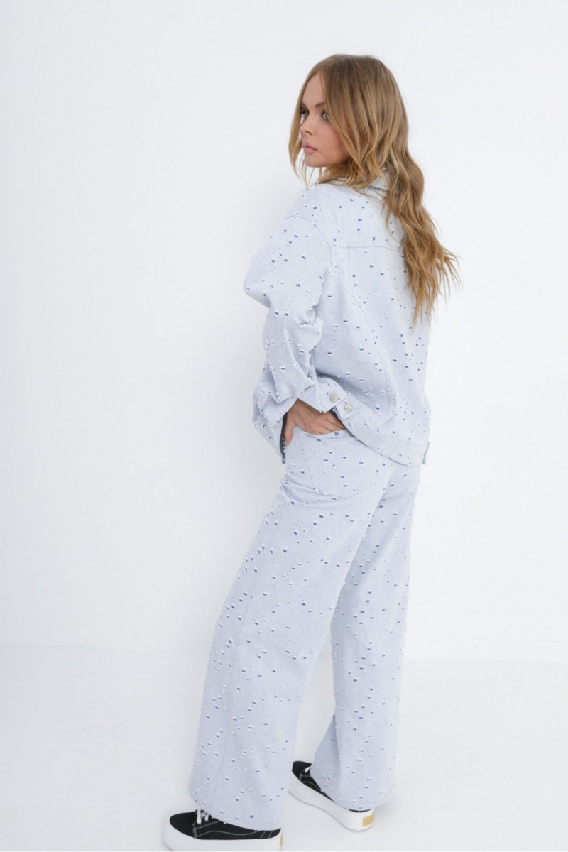 Широкие брюки из хлопкового джинса с перфорацией. Детали: высокая посадка, прилегающий силуэт, притачной пояс со шлевками, застежка на молнию и пуговицу, перед с боковыми карманами, спинка с кокеткой и двумя накладными карманами. Длина по боковому шву с поясом около 106 см в размерах 40-46 и около 112 см в размерах 48-52 см. Длина по внутреннему шву около 78,5 см