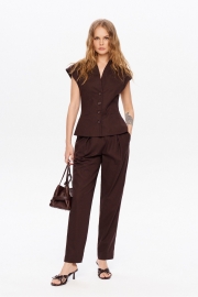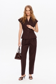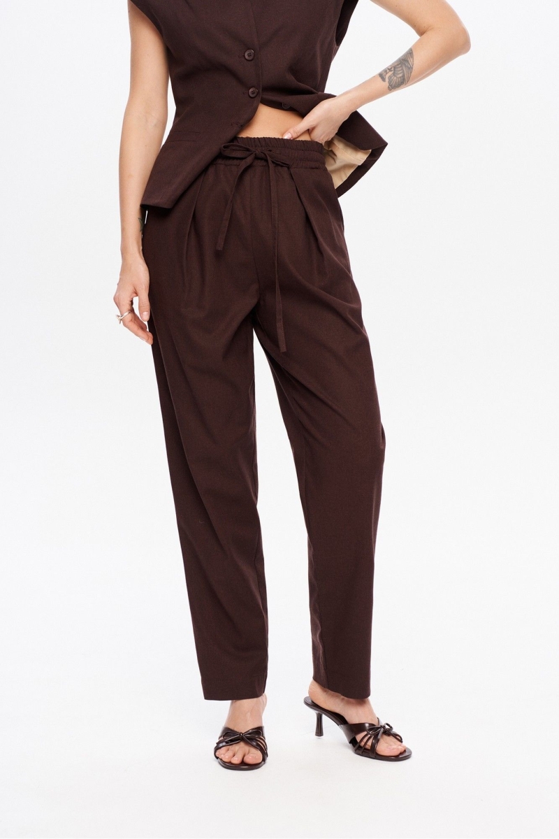 Льняные укороченные брюки с поясом-резинкой. Детали: брюки с высокой посадкой, притачной пояс с резинкой и шнурами, без застежки, боковые карманы, передние части брюк со складками у пояса. Длина по боковому шву с поясом около 101 см в размерах 40-46 и около 102,5 см в размерах 48-52, длина по внутреннему шву около 72 см