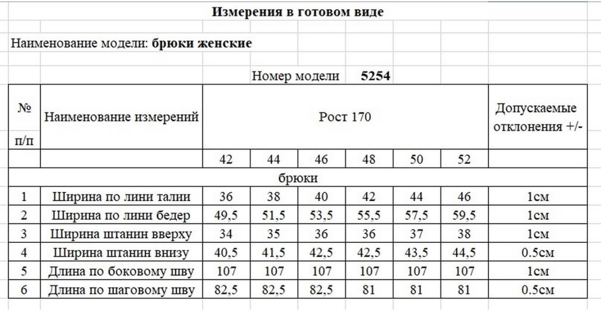 Таблица размеров