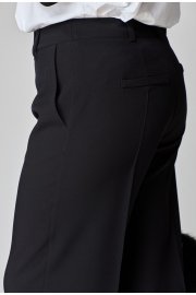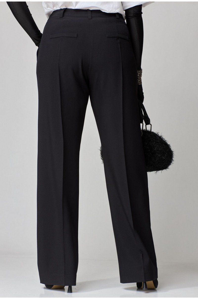 Брюки классической формы, прямого силуэта, со стрелками по передним и задним половинкам. Верхний срез обработан обтачным поясом, дополнен практичными шлевками для ремня. На задних половинках расположены талиевые вытачки, с настрочными декоративными листочками. В боковых швах брюк обработаны наклонные карманы. Застёжка центральная на тесьму молнию и крючок.